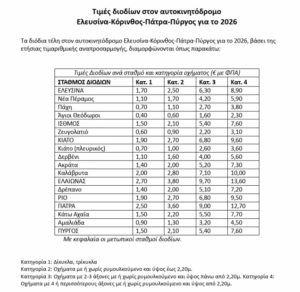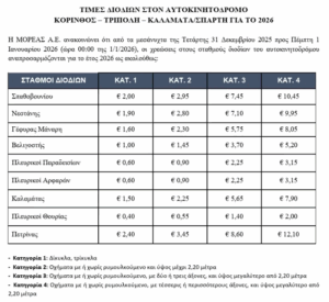 Στο μεταξύ, η Ολυμπία Οδός (Αθήνα-Πύργος) και ο Μορέας (Κόρινθος-Καλαμάτα/Σπάρτη), ανακοίνωσαν εξίσου αύξηση στις τιμές των διοδίων από την Πέμπτη 1 Ιανουαρίου 2026 (ώρα 00:00) λόγω της ετήσιας τιμαριθμικής προσαρμογής που εφαρμόζουν οι παραχωρησιούχοι των οδικών αξόνων.