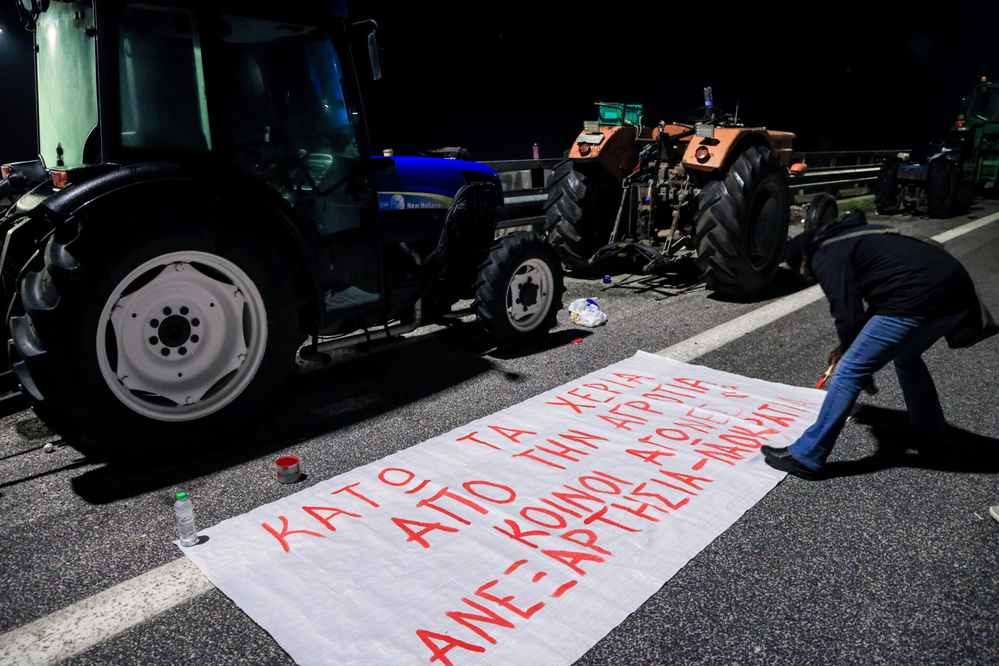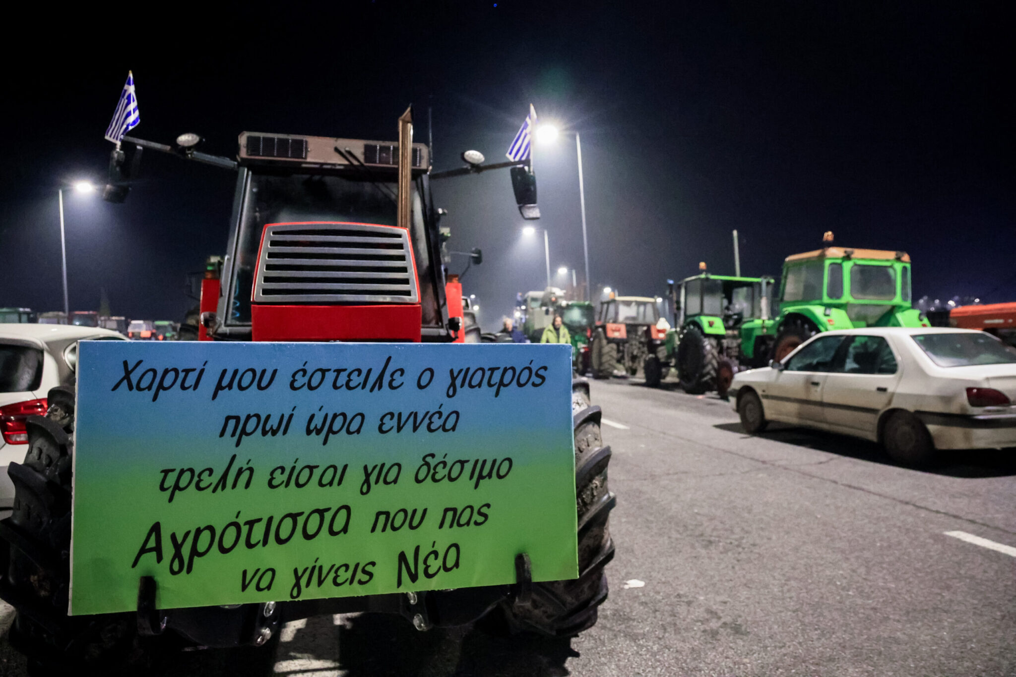 Παρατεταγμένα παραμένουν τα τρακτέρ και τα αγροτικά οχήματα των αγροτών και κτηνοτρόφων στα «Πράσινα Φανάρια», στο κομβικό σημείο της διασταύρωσης πριν από το αεροδρόμιο «Μακεδονία». Λίγα μέτρα πιο μπροστά, παραμένουν εγκατεστημένα αστυνομικά οχήματα οριζόντια επί τους οδοστρώματος, αποτρέποντας έτσι τυχόν μετάβαση παραγωγών στον κόμβο του αεροδρομίου.