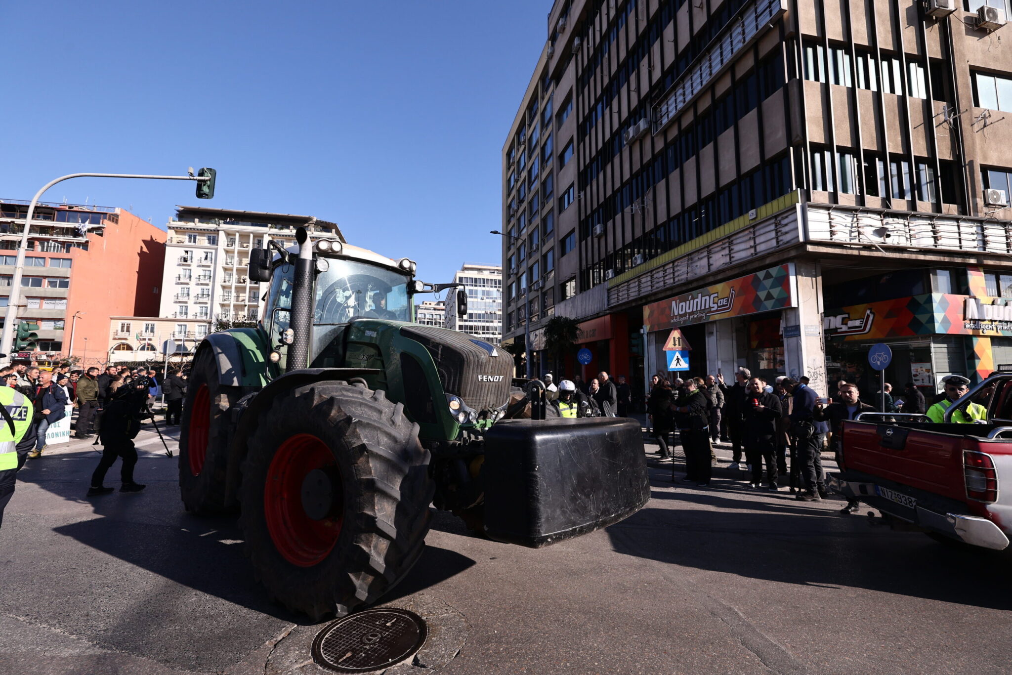 Αγρότες από τα Πράσινα Φανάρια ξεκίνησαν με τρακτέρ και αγροτικά οχήματα. Κινήθηκαν στην Γεωργικής Σχολής προς την Εθνικής Αντιστάσεως και μέσω της Βασ. Όλγας και της Τσιμισκή θα καταλήξουν στο λιμάνι.