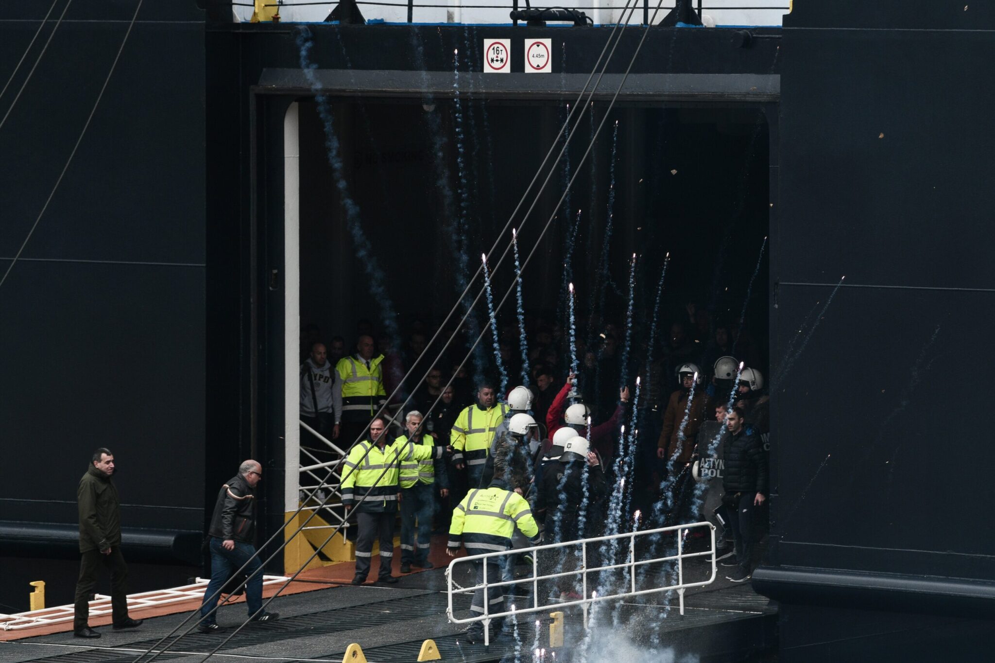 Νωρίτερα, μία όμάδα αστυνομικών με πολιτικά επιχειρεί αιφνιδιασμό. Ξαφνικά πηδάνε πάνω από την περίφραξη του λιμανιού και περνούν στην αντεπίθεση. Τα δακρυγόνα είναι στην ημερήσια διάταξη, ενώ μάλλον δεν βρέθηκε κάποιος να ευχηθεί ”καλό ταξίδι”…