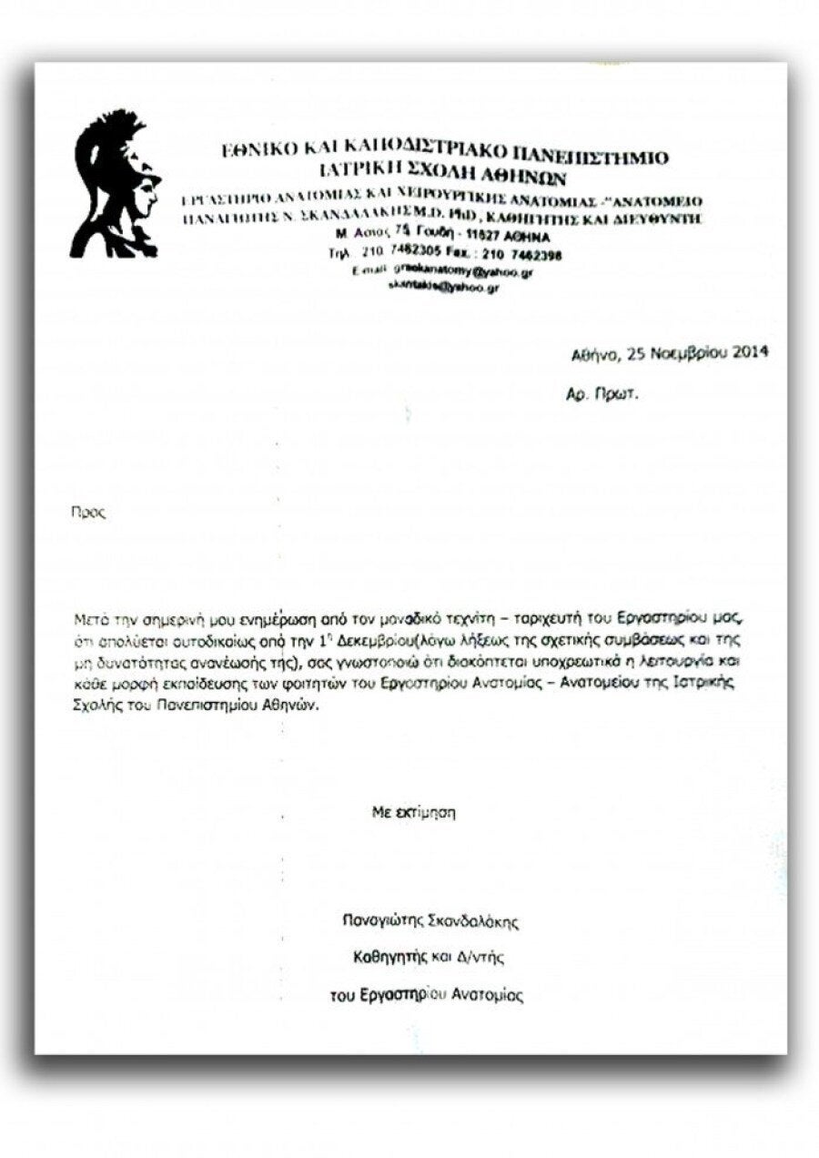 Αυτό τουλάχιστον αναγράφεται σε σχετικό έγγραφο, του εργαστηρίου Ανατομίας, που αν και από κάτω έχει το όνομα του Διευθυντή του εργαστηρίου, του καθηγητή Παναγιώτη Σκανδαλάκη, δεν φέρει την υπογραφή του ούτε έχει αριθμό πρωτοκόλλου.