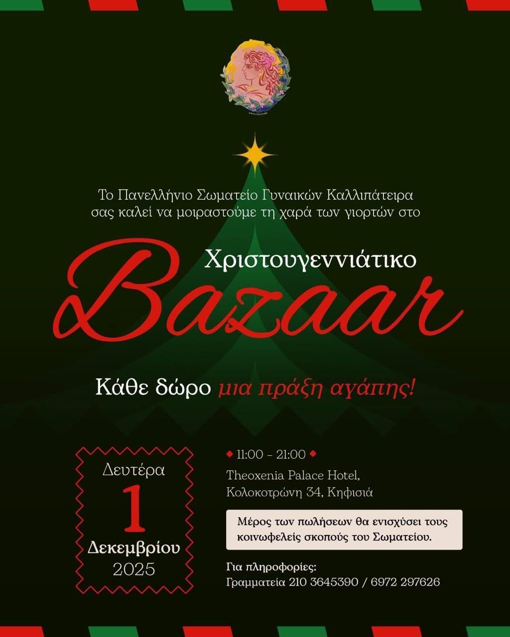 Το Πανελλήνιο Σωματείο Γυναικών «Καλλιπάτειρα» προσκαλεί μέλη και φίλους του να μοιραστούν τη μαγεία των Χριστουγέννων στο φετινό Χριστουγεννιάτικο Bazaar, που θα πραγματοποιηθεί τη Δευτέρα 1 Δεκεμβρίου, στο Theoxenia Palace Hotel στην Κηφισιά, από τις 11:00 το πρωί ως τις 21:00 το βράδυ.