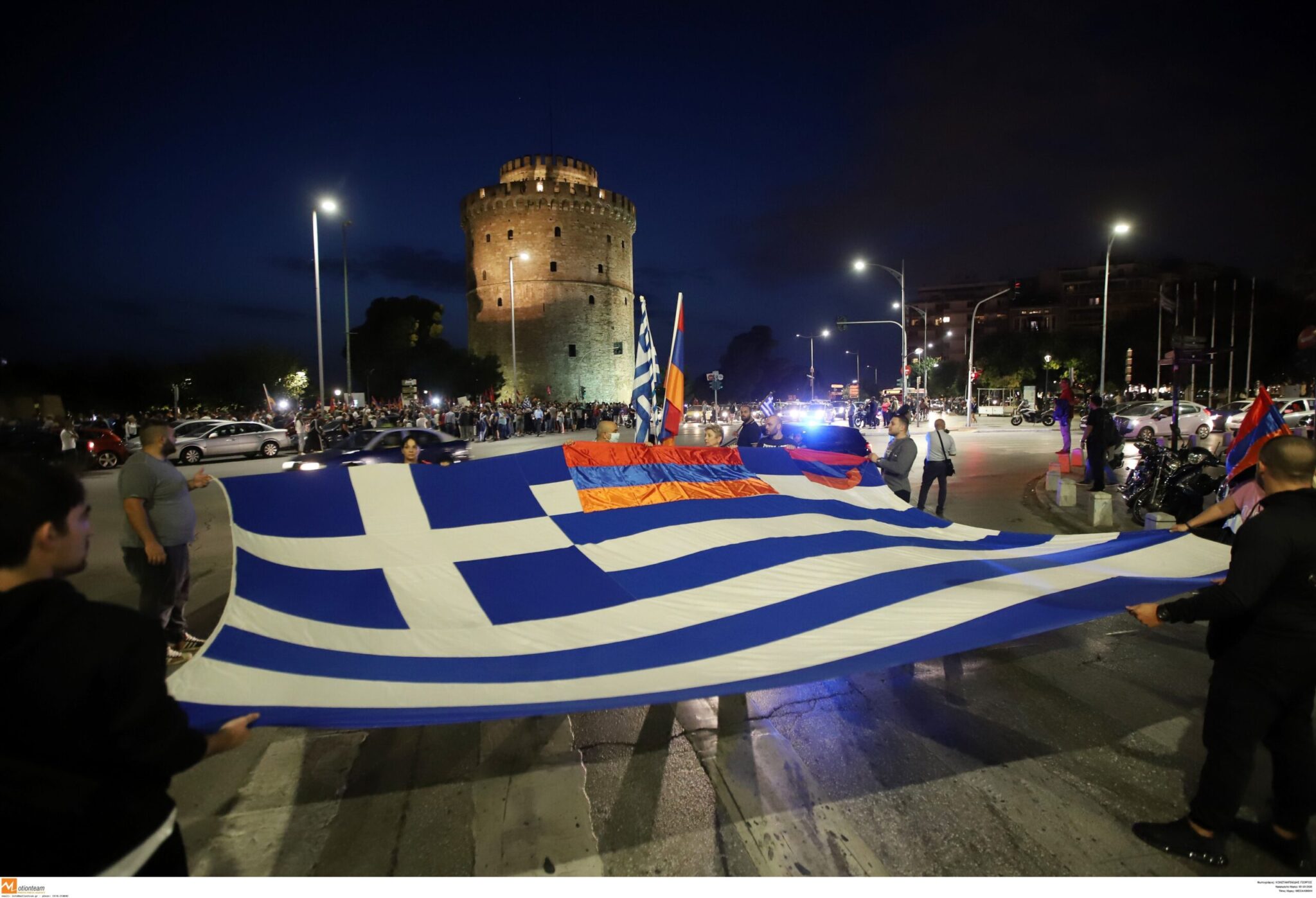 Κρατώντας πλακάτ με συνθήματα όπως «Το Αρτσάχ ανήκει στην Αρμενία», «απαιτούμε άμεση κατάπαυση πυρός», οι διαδηλωτές συγκεντρώθηκαν στον Λευκό Πύργο και φώναξαν συνθήματα καταγγέλλοντας «τις φιλοπόλεμες επιθετικές διαθέσεις του Αζερμπαϊτζάν, που χωρίς ίχνος ανθρωπιστικών αξιών, βομβαρδίζει χωρίς κανένα έλεος πόλεις και αμάχους» και φωνάζοντας ότι «το τίμημα είναι βαρύ, οι ανθρώπινες ζωές δε γυρίζουν πίσω, όμως το δίκαιο είναι με το μέρος μας και σε όλον τον κόσμο αυτή τη στιγμή όλοι οι Αρμένιοι όπου κι αν βρισκόμαστε είμαστε ενωμένοι σαν μια γροθιά και είναι καθήκον μας να αγωνιστούμε για την πατρίδα μας».