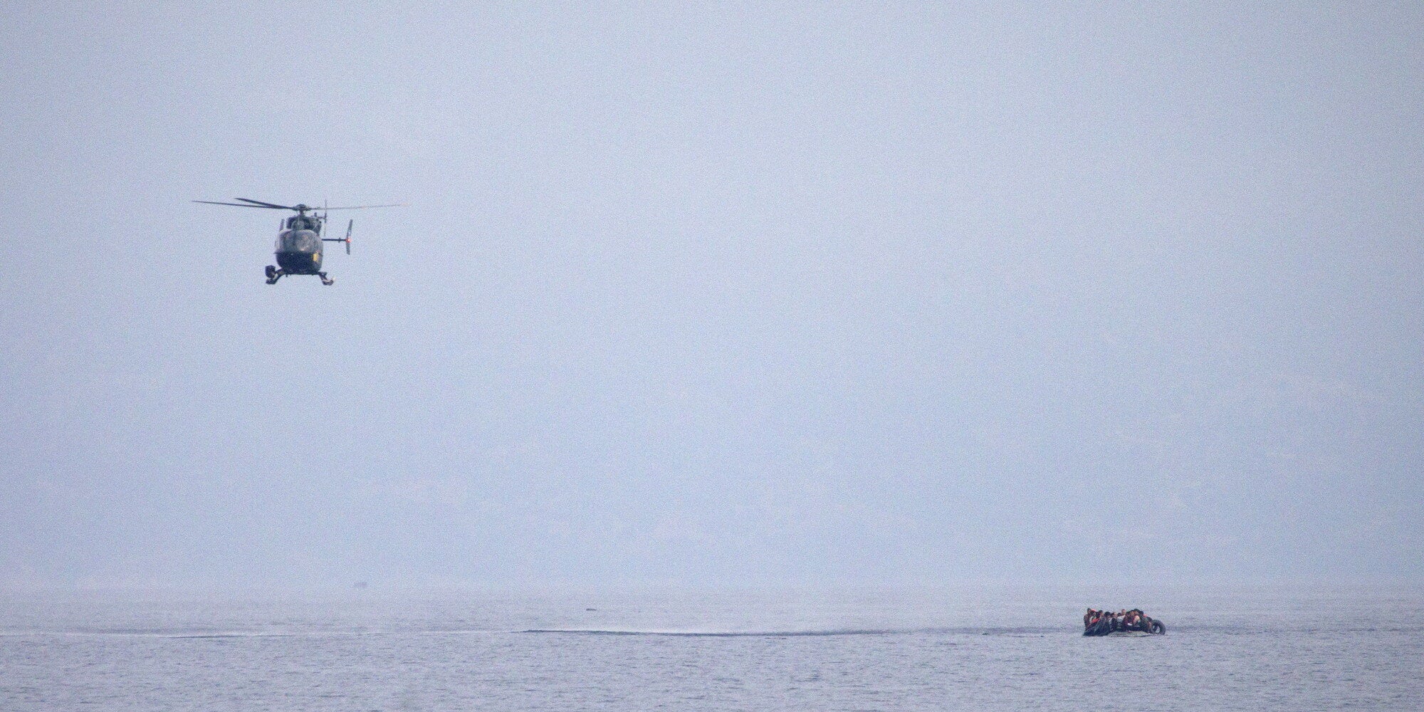 A Frontex helicopter flies over an overcrowded dinghy carrying refugees and migrants to the Greek island of Lesbos, while crossing a part of the Aegean Sea from the Turkish coast, September 28, 2015. A record number of at least 430,000 refugees and migrants have taken rickety boats across the Mediterranean to Europe this year, 309,000 via Greece, according to International Organization for Migration figures. REUTERS/Dimitris Michalakis