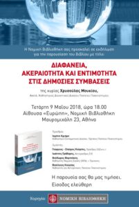 Παρουσιάζεται την Τετάρτη 9 Μαΐου 2018 το νέο βιβλίο της Αναπληρώτριας Καθηγήτριας του Διοικητικού Δικαίου στο Πάντειο Πανεπιστήμιο, κυρίας Χρυσούλας Μουκίου, το οποίο τιτλοφορείται: «Διαφάνεια, Ακεραιότητα και Εντιμότητα στις Δημόσιες Συμβάσεις – Η σταδιακή αφομοίωση του διεθνούς Soft Law σε επίπεδο Δημόσιων Συμβάσεων».