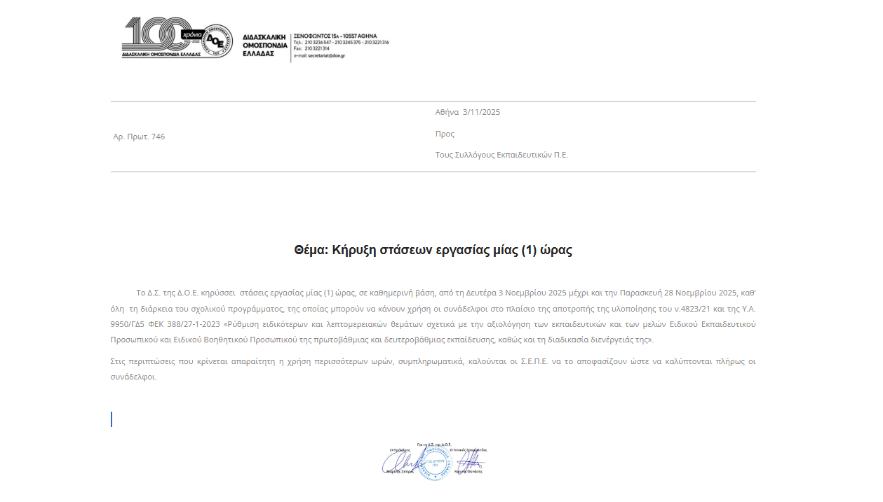 «Στάσεις εργασίας μίας (1) ώρας, σε καθημερινή βάση, από τη Δευτέρα 3 Νοεμβρίου 2025 μέχρι και την Παρασκευή 28 Νοεμβρίου 2025, καθ’ όλη τη διάρκεια του σχολικού προγράμματος» κηρύσσει η Διδασκαλική Ομοσπονδία Ελλάδας (ΔΟΕ) με Δελτίο Τύπου που εξέδωσε συνεχίζοντας το πρόγραμμα δράσης ενάντια στην αξιολόγηση των εκπαιδευτικών στα δημοτικά σχολεία και τα νηπιαγωγεία της χώρας.