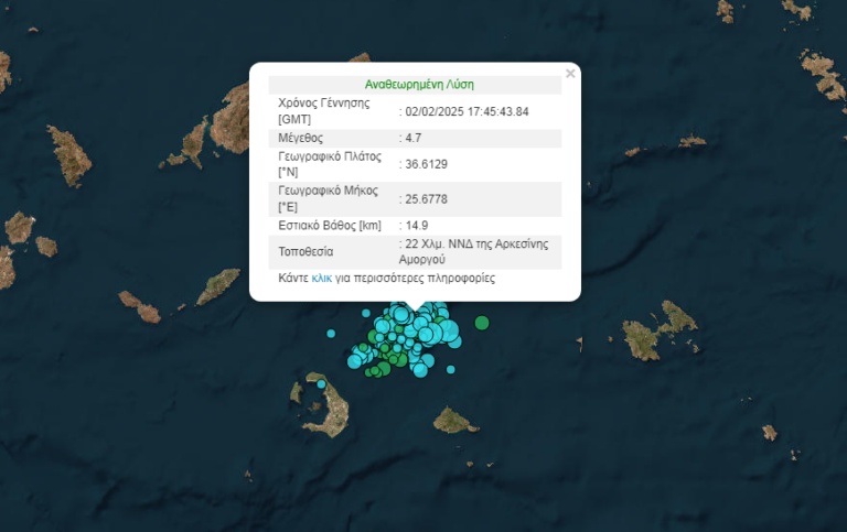 Η δεύτερη δόνηση των 4,7 Ρίχτερ, ήταν ένα χιλιόμετρο πιο κοντά στην Αμοργό, με εστιακό βάθος 14,9χλμ.