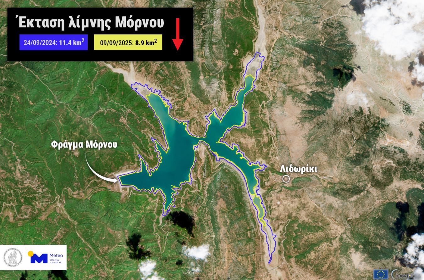 Το Παρατηρητήριο της Τεχνητής Λίμνης Μόρνου του meteo, απαθανάτισε στις 9 Σεπτεμβρίου την λίμνη και φαίνεται να έχει τη μικρότερη έκταση των τελευταίων χρόνων, από το 2014 και έπειτα. Συγκεκριμένα, η σημερινή έκταση της είναι 8,9 τετραγωνικά χιλιόμετρα, όταν πέρσι έφτανε τα 11,4 τ.χ. και το 2023 τα 15,3 τ.χ.