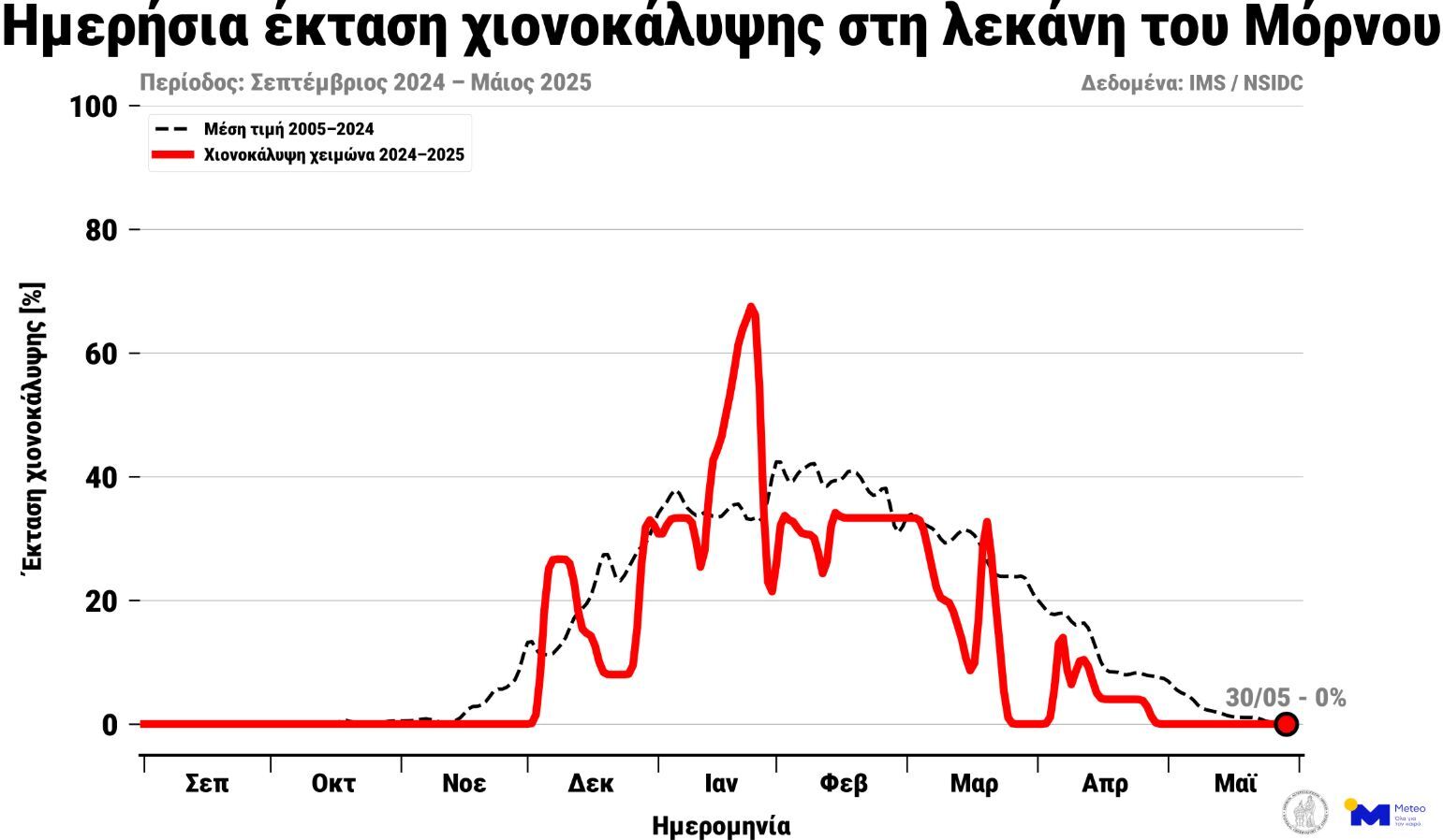 Το Παρατηρητήριο παρουσιάζει επίσης την πορεία της χιονοκάλυψης στην ευρύτερη περιοχή γύρω από την λίμνη. Η έκταση της χιονοκάλυψης στα βουνά της περιοχής τον χειμώνα του 2025 ήταν κατά 20% μειωμένη σε σχέση με τον μέσο όρο 2005-2024. Μάλιστα, το 65% των ημερών του χειμώνα που μας πέρασε σημειώθηκε μικρότερη έκταση χιονοκάλυψης σε σχέση με την περίοδο 2005-2024.