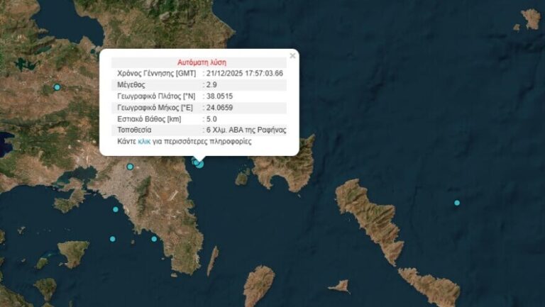 Δύο σεισμοί 2,9 Ρίχτερ και 2,7 Ρίχτερ σημειώθηκαν βορειοανατολικά της Ραφήνας το βράδυ της Κυριακής.