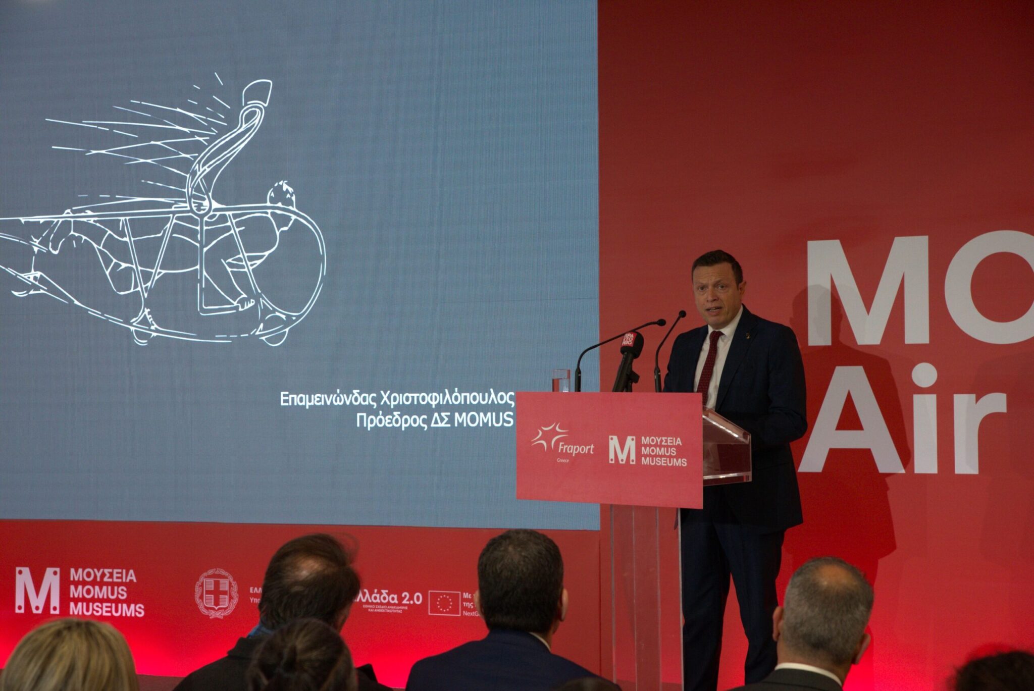 Ο Πρόεδρος του Διοικητικού Συμβουλίου του MOMUS, κ. Επαμεινώνδας Χριστοφιλόπουλος ανέφερε: «Η δημιουργία του MOMUS Air μέσα στον χώρο του αεροδρομίου «Μακεδονία» της Θεσσαλονίκης είναι μια ιδέα που, εκ πρώτης όψεως, μοιάζει σχεδόν αυτονόητη: πολιτισμός σε έναν χώρο διαρκούς κίνησης, αναμονής και μετάβασης. Η ανάπτυξη όμως ενός μουσειακού εκθεσιακού χώρου σε ένα αεροδρόμιο είναι ένα τεχνικά, θεσμικά και επιχειρησιακά εξαιρετικά σύνθετο εγχείρημα, και όχι απλώς μια χωροταξική επιλογή. Είναι μια άσκηση ισορροπίας ανάμεσα σε διαφορετικούς κόσμους, με διαφορετικές προτεραιότητες, κανόνες και ευθύνες. Το γεγονός ότι σήμερα εγκαινιάζουμε το MOMUS Air αποτυπώνει ξεκάθαρα τη βούληση των ανθρώπων της Fraport Greece και του MOMUS να υπερβούν τις δυσκολίες και να κάνουν πράξη μια ιδέα με σαφές διεθνές, πολιτιστικό και κοινωνικό, ρεαλιστικό αποτύπωμα».