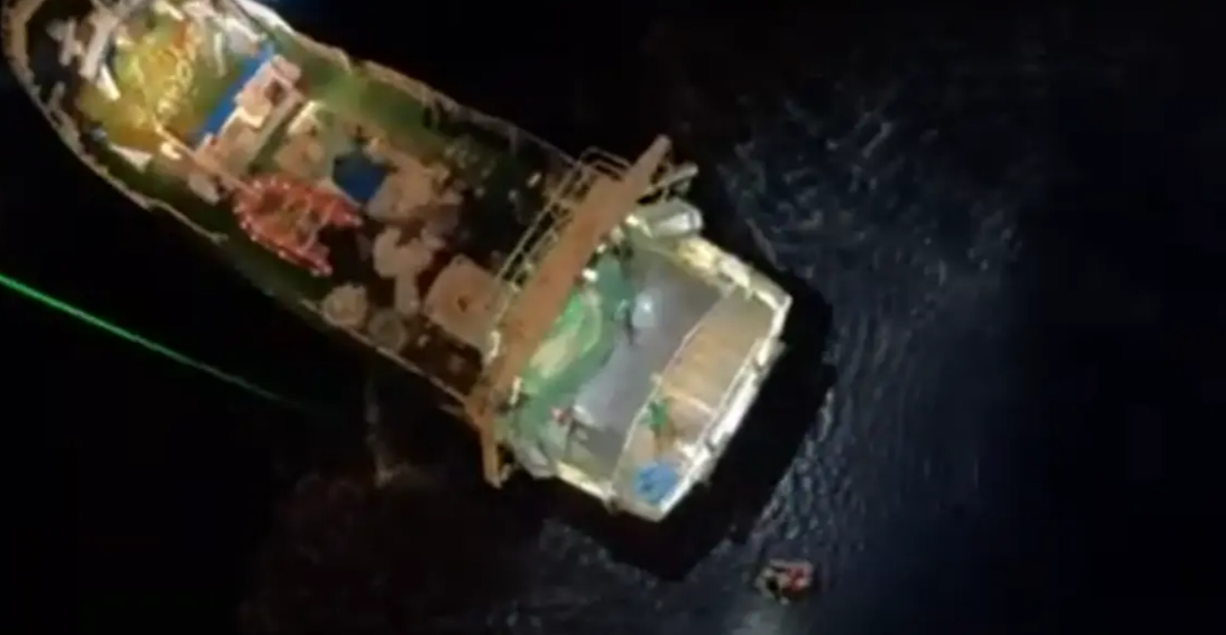 Στο βίντεο που έδωσε στη δημοσιότητα η Πολεμική Αεροπορία φαίνεται ο διασώστης να κατεβαίνει με σκοινί στο αλιευτικό «Eros B», το οποίο έπλεε 5 ναυτικά μίλια βόρεια της Αστυπάλαιας.