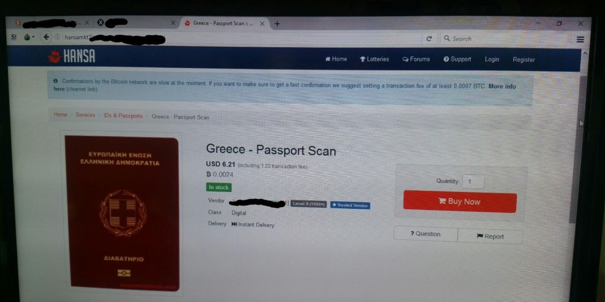Σε έρευνα του «Ελεύθερου Τύπου» της Κυριακής στα «σκοτεινά» μονοπάτια του διαδικτύου εντοπίστηκε κρυπτογραφημένη σελίδα, η οποία διαθέτει προς πώληση ελληνικά διαβατήρια έναντι 0,0024 bitcoin (ψηφιακό νόμισμα), ποσό που αντιστοιχεί σε πέντε ευρώ. Η σελίδα αναφέρει ότι τα ελληνικά διαβατήρια βρίσκονται σε απόθεμα και, μάλιστα, σε πολύ συμφέρουσα τιμή.