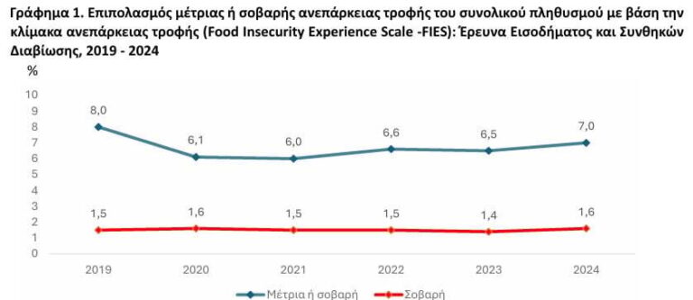 Το 7% του πληθυσμού της Ελλάδας δήλωσε ότι αντιμετώπισε πέρυσι (εισοδήματα 2023) μέτρια ή σοβαρή ανεπάρκεια τροφής, ενώ το 1,6% μόνο σοβαρή ανεπάρκεια (βάσει της παγκόσμιας τυπικής κλίμακας ανεπάρκειας τροφής – FIES).