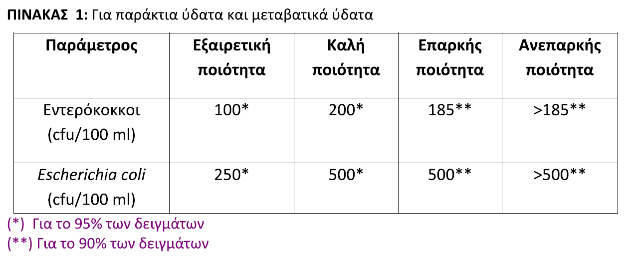 Η αξιολόγηση και η ταξινόμηση των υδάτων κολύμβησης, παρουσιάζεται στον ακόλουθο πίνακα: