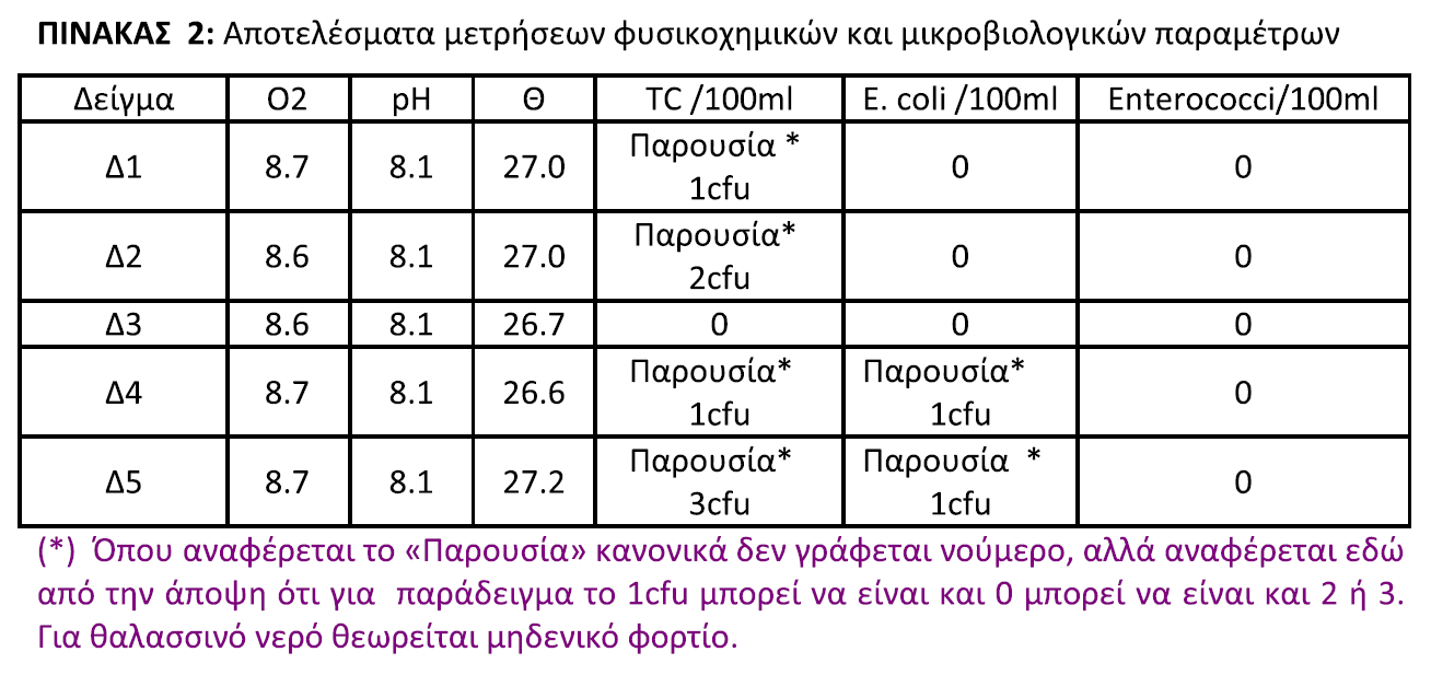 Ο χειρισμός των δειγμάτων έγινε σύμφωνα με την ευρωπαϊκή οδηγία 2006/7/ΕΕ η οποία ως κριτήρια ποιότητας θέτει δύο μικροβιολογικές ομάδες (εντερόκοκκοι και κολοβακτηρίδια). Επίσης τα ύδατα ελέγχθηκαν οπτικώς για την παρουσία ρύπων, όπως κατάλοιπα πίσσας, γυαλιά, πλαστικά, καουτσούκ ή οποιαδήποτε άλλα απόβλητα και όπως σημειώνεται “δεν διαπιστώθηκε καμία τέτοια παρουσία”. Παράλληλα έγιναν μετρήσεις διαλυμένου οξυγόνου (DO), pH και θερμοκρασίας του νερού με φορητά όργανα πεδίου.