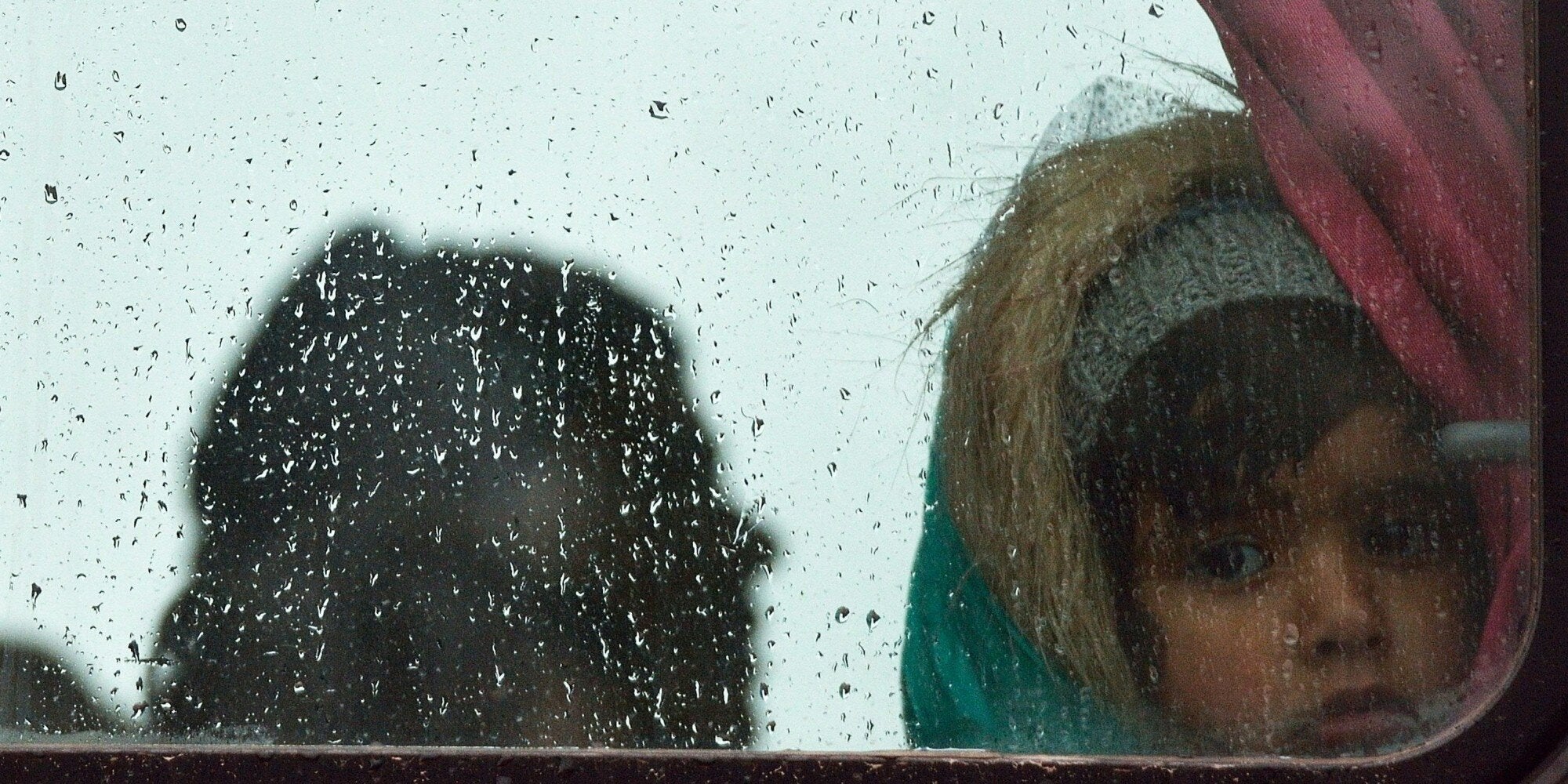 A child looks out a bus window as refugees are returned to a makeshift camp at the Greek-Macedonian border, near the Greek village of Idomeni, on March 15, 2016, where thousands of refugees and migrants are stranded by the Balkan border blockade.Around 1,500 refugees left the Idomeni camp on March 14, to find a way to Macedonia. They was stopped by the Macedonian police and return back on the same way they come. The German and Greek leaders blasted Balkan countries for shutting their borders to migrants ahead of an upcoming EU ministers meeting. Greek authorities said there were 41,973 asylum seekers in the country, including some 12,000 stuck at Idomeni on the closed Macedonian border. / AFP / DANIEL MIHAILESCU (Photo credit should read DANIEL MIHAILESCU/AFP/Getty Images)
