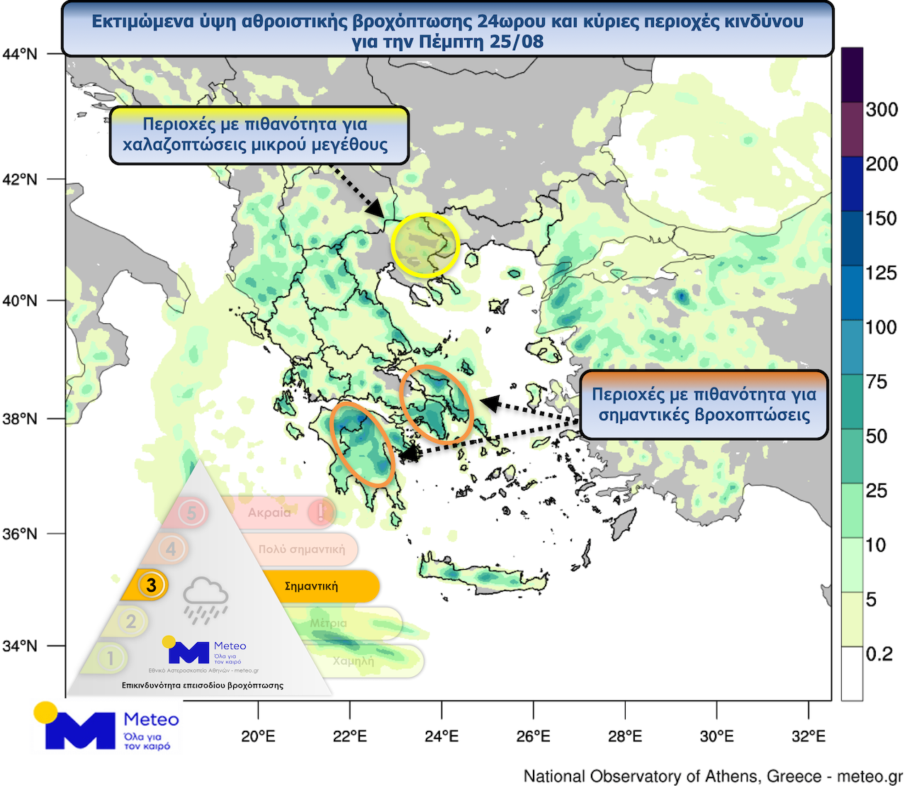 Για σήμερα Πέμπτη αναμένονται βροχές και καταιγίδες τόσο σε ηπειρωτικά όσο και σε νησιωτικά τμήματα του Ιονίου και του Αιγαίου. Τα φαινόμενα κατά τόπους σε τμήματα της ανατολικής Στερεάς και της Πελοποννήσου θα είναι έντονα και είναι πιθανό να σημειωθούν σημαντικά ύψη βροχής και πιθανώς πλημμυρικά επεισόδια. Οι καταιγίδες τοπικά σε τμήματα της κεντρικής και ανατολικής Μακεδονίας είναι πιθανό να συνοδεύονται από χαλαζοπτώσεις μικρού μεγέθους.
