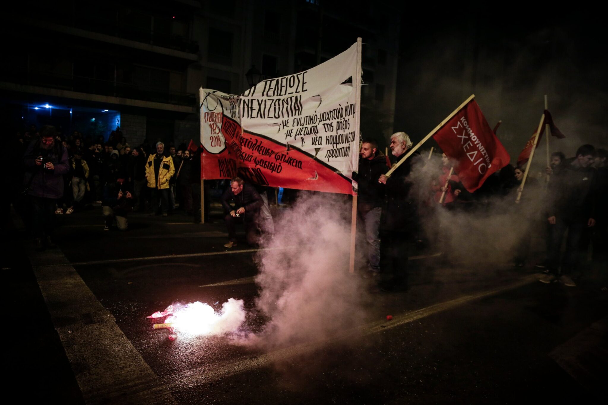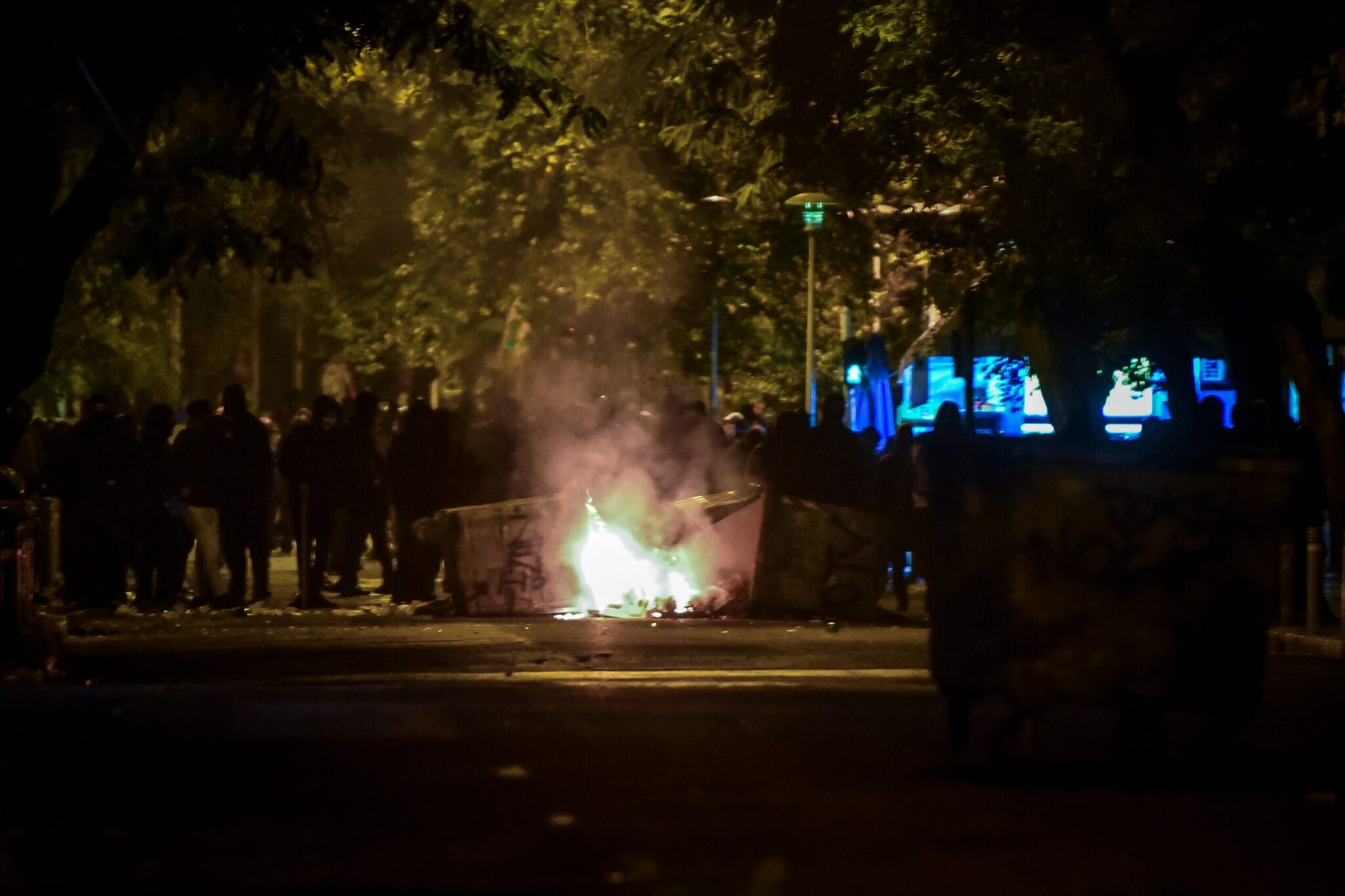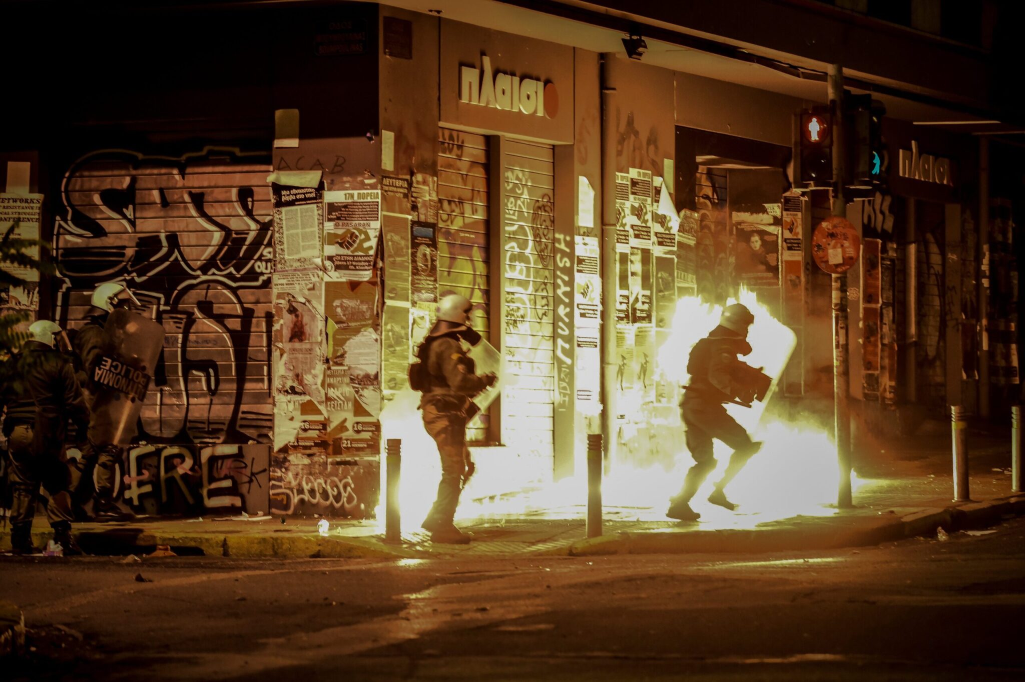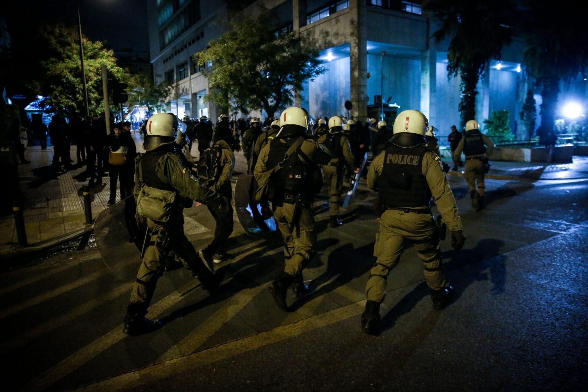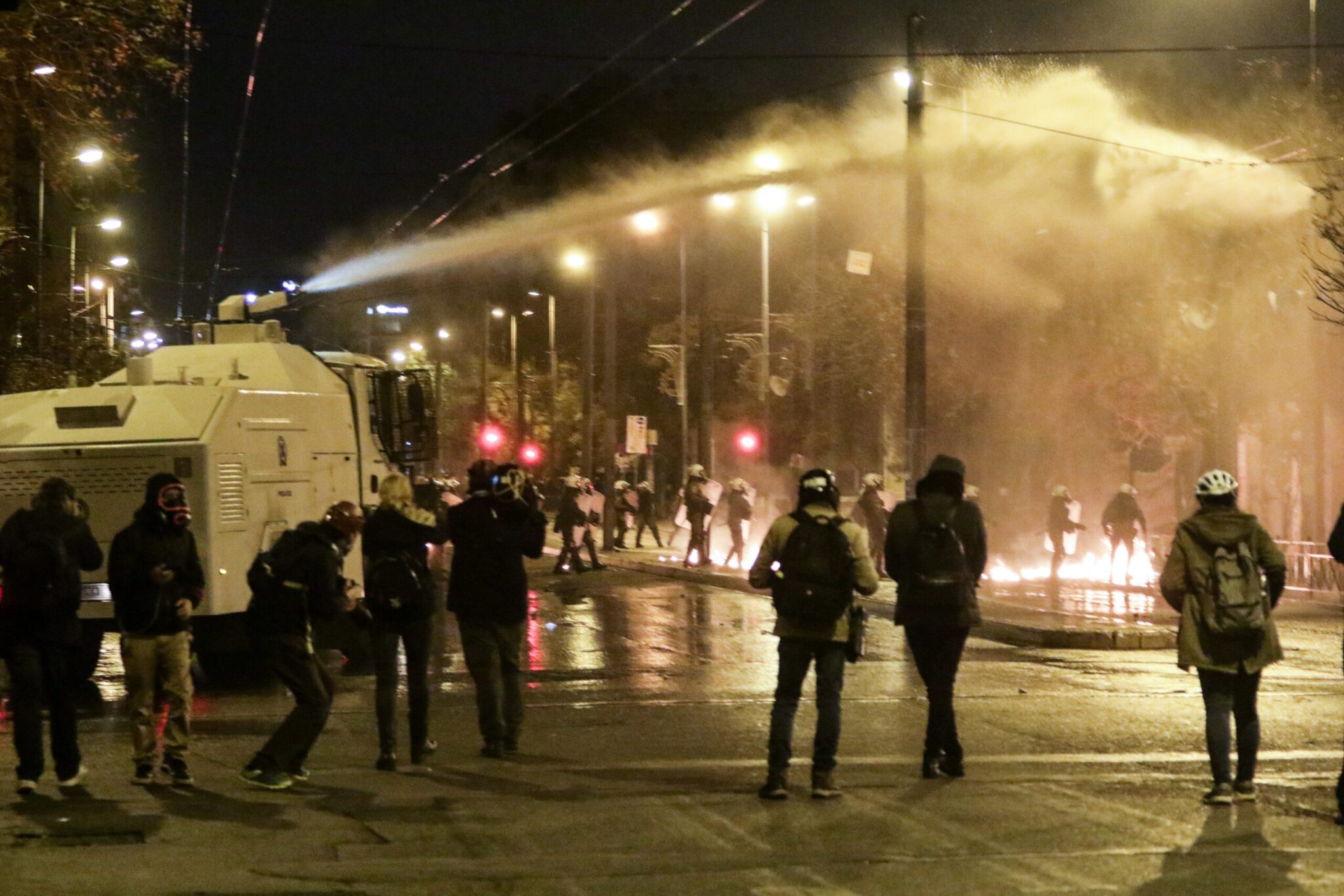 Ειδικό όχημα της ελληνικής αστυνομίας έκανε ρίψεις νερού επί της οδού Πατησίων προς την πλευρά του Πολυτεχνείου όπου ήταν συγκεντρωμένα αρκετά άτομα. Τα άτομα αυτά πέταξαν δεκάδες βόμβες μολότοφ, πέτρες και κομμάτια από μάρμαρα κατά των αστυνομικών δυνάμεων που από την πλευρά τους έκαναν ρίψεις χειροβομβίδων κρότου λάμψης καθώς και δακρυγόνων προκειμένου να απομακρύνουν τους ταραξίες.