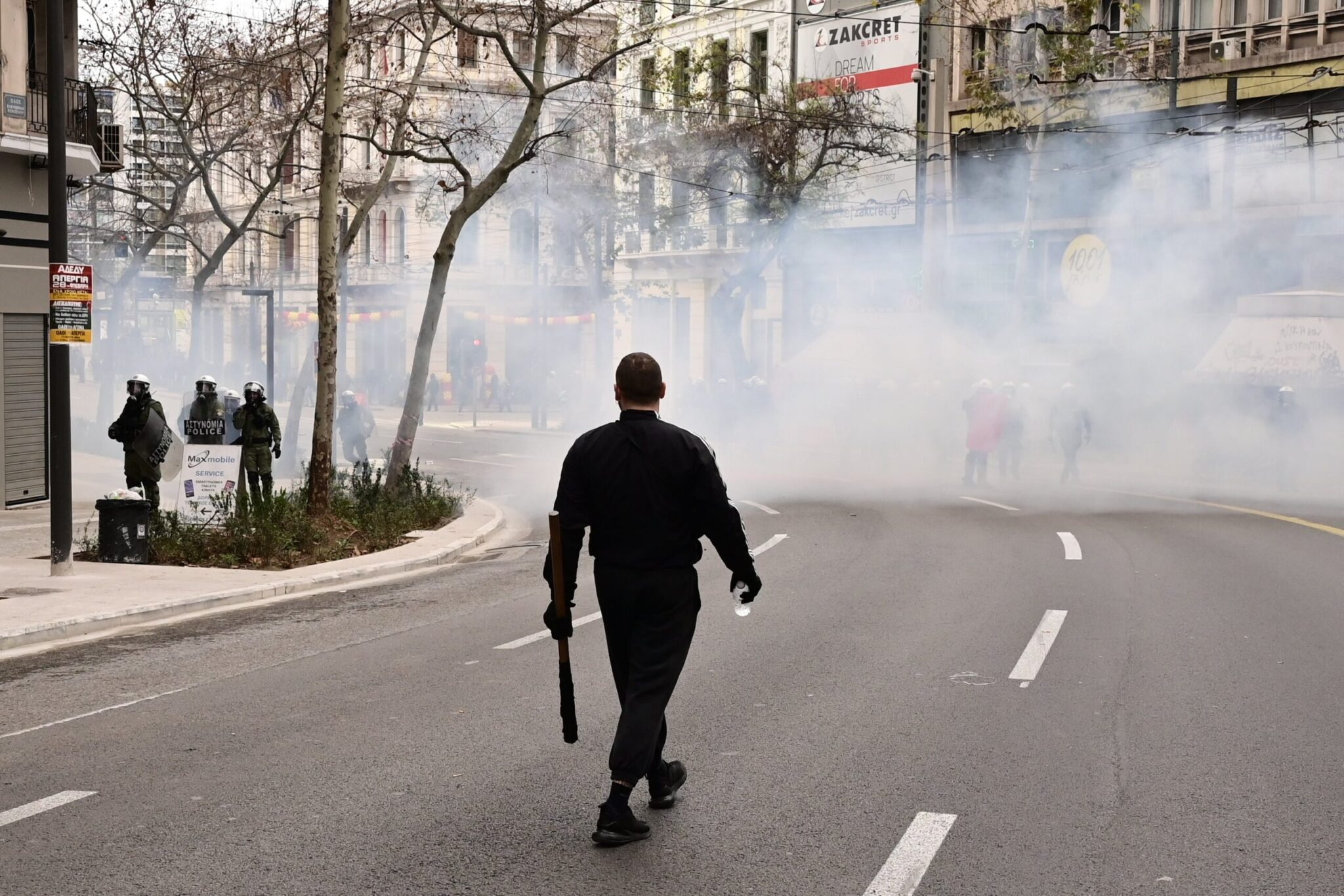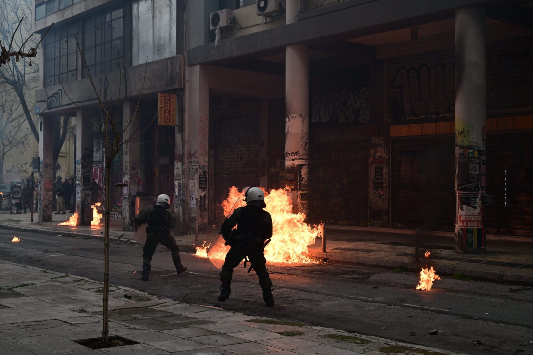 Επεισόδια σε Σύνταγμα – Ομόνοια: Μολότοφ, ρίψη νερού από τον Αίαντα, φωτιές, ΜΑΤ, κουκουλοφόροι