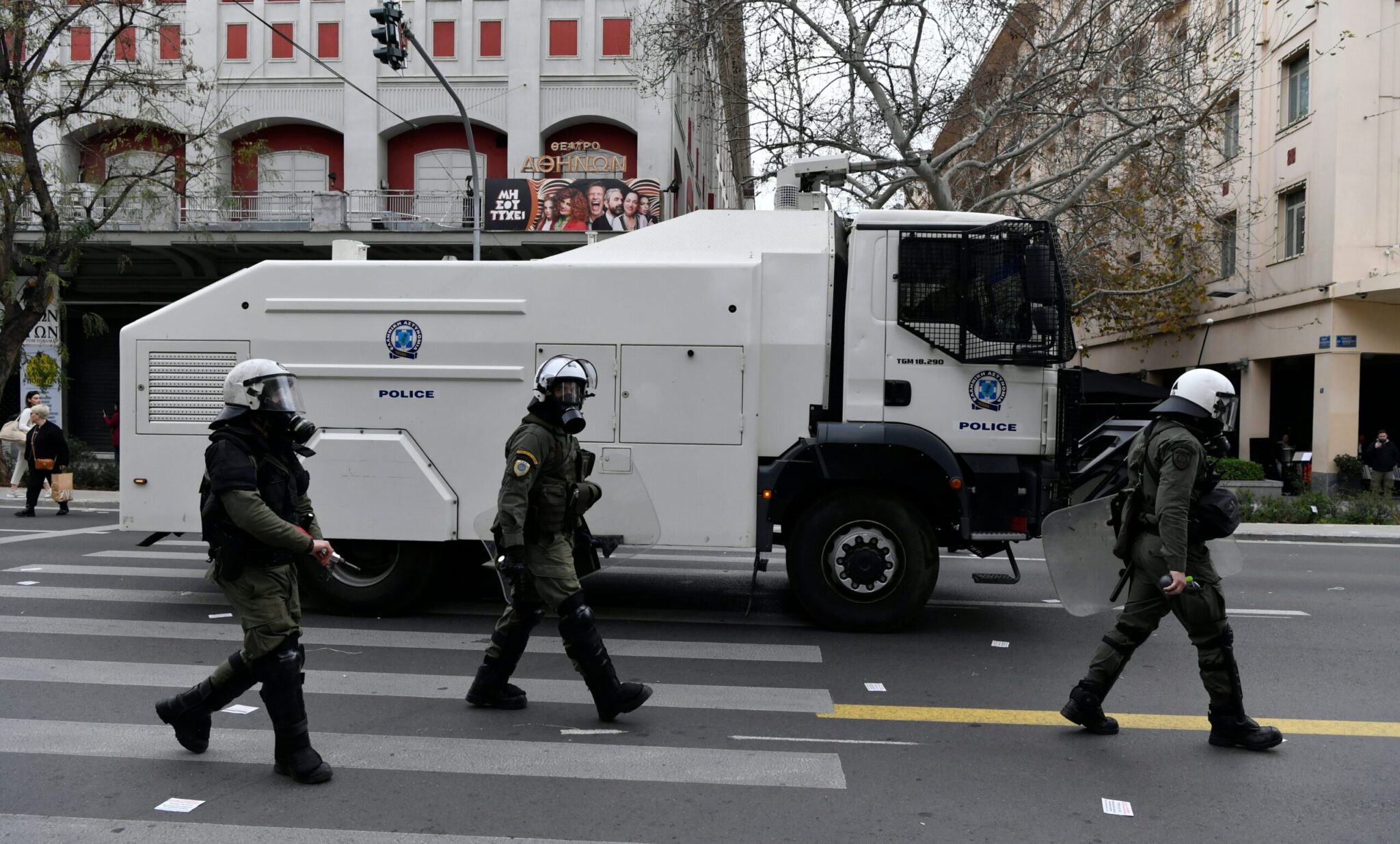 Αστυνομικοί των ΜΑΤ δίπλα σε ένα κανόνι νερού στην Αθήνα, Τετάρτη, 28 Φεβρουαρίου 2024. Εκτεταμένες απεργίες στην Ελλάδα διέκοψαν τις συγκοινωνίες την Τετάρτη, σταμάτησαν φέρι μποτ και τρένα, ενώ η συγκέντρωση διαμαρτυρίας οργανώνεται με αφορμή την επέτειο του θανατηφόρου σιδηροδρομικού δυστυχήματος πριν ένα χρόνο, στα Τέμπη. (AP Photo/Michael Varaklas)Επεισόδια μετά το τέλος της απεργιακής συγκέντρωσης και πορείας πρωτοβαθμιων σωματείων, αριστερών οργανώσεων, συλλογικοτήτων και φοιτητικών συλλόγων στα πλαίσια της 24ωρης απεργίας της ΑΔΕΔΥ στην Αθήνα, Τετάρτη 28 Φεβρουαρίου 2024. (ΜΙΧΑΛΗΣ ΚΑΡΑΓΙΑΝΝΗΣ/EUROKINISSI)