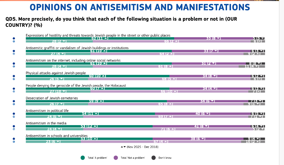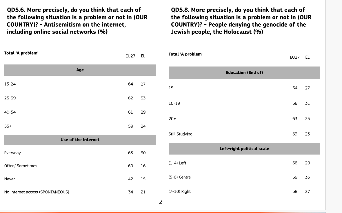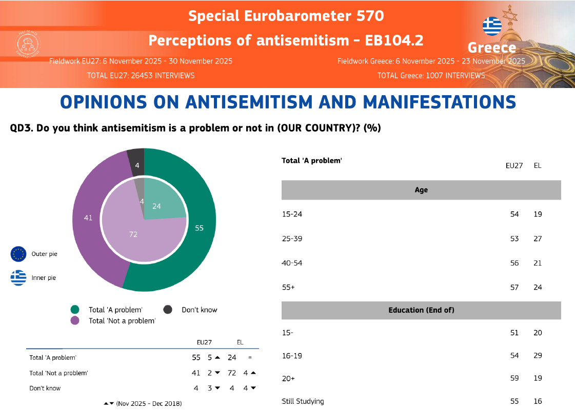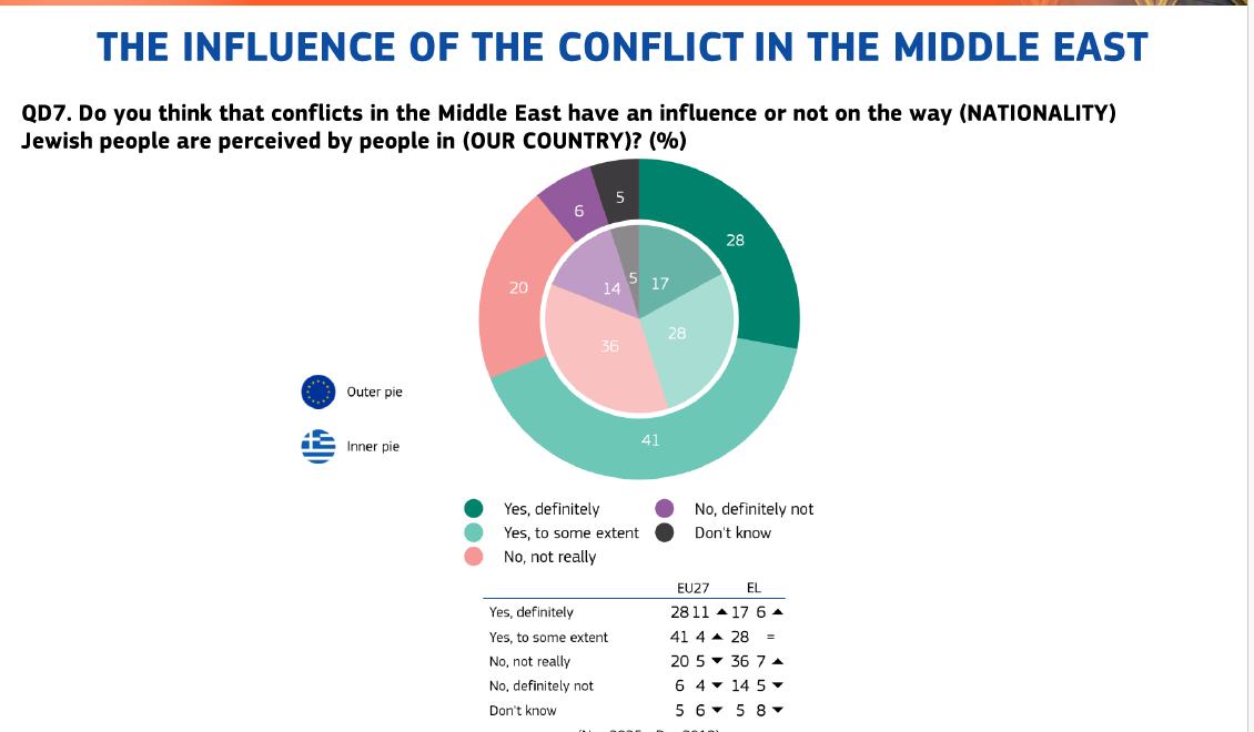 Στις εκφράσεις εχθρότητας και απειλές κατά Εβραίων σε δρόμους και άλλους δημόσιους χώρους, μόλις το 28% των Ελλήνων θεωρεί ότι πρόκειται για πρόβλημα στη χώρα, έναντι 62% στον μέσο όρο της Ευρωπαϊκής Ένωσης.