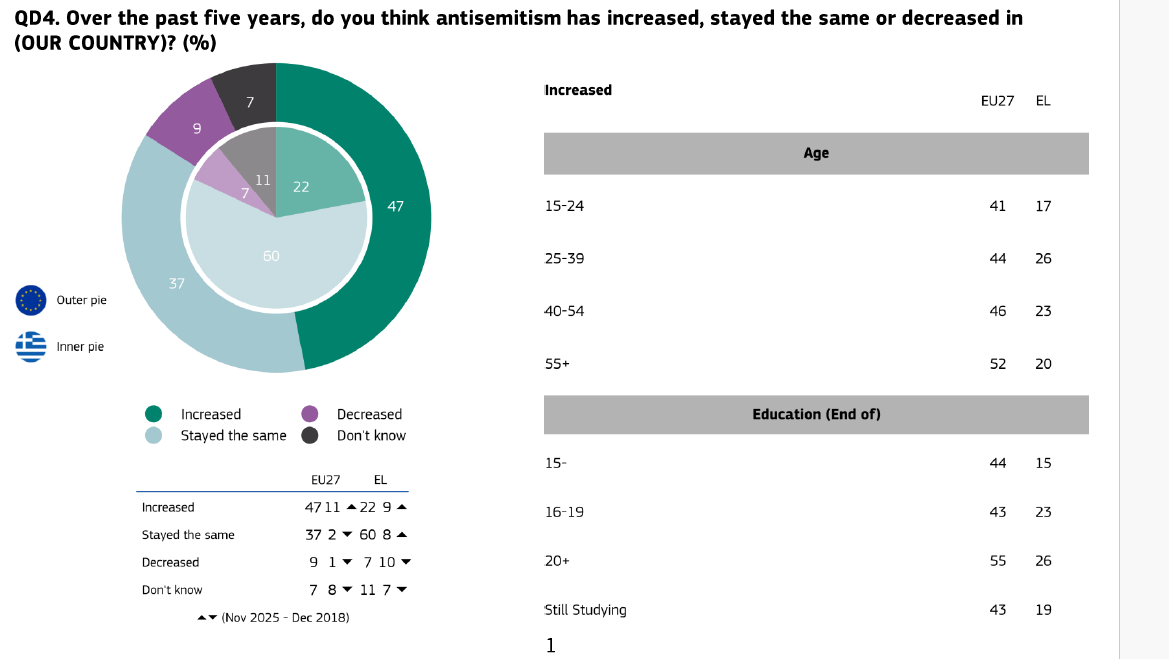 Στο ερώτημα κατά πόσο ο αντισημιτισμός έχει αυξηθεί τα τελευταία πέντε χρόνια, η Ελλάδα εμφανίζει και πάλι σημαντική απόκλιση από τον ευρωπαϊκό μέσο όρο. Ενώ στην Ευρωπαϊκή Ένωση σχεδόν οι μισοί πολίτες, ποσοστό 47%, εκτιμούν ότι ο αντισημιτισμός έχει αυξηθεί στη χώρα τους, στην Ελλάδα το αντίστοιχο ποσοστό περιορίζεται στο 22%.