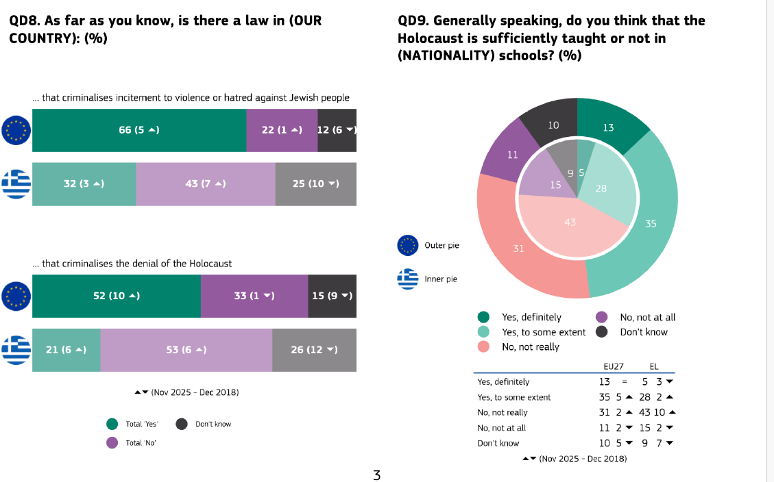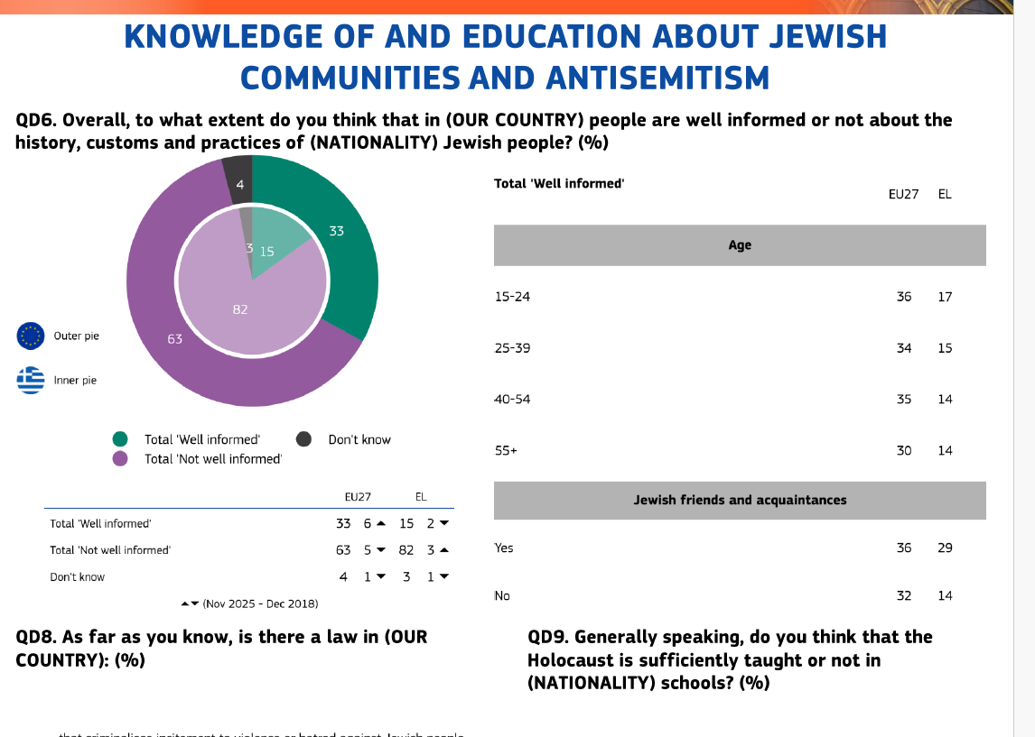 Η απόσταση της Ελλάδας από την ευρωπαϊκή εικόνα καταγράφεται και στο επίπεδο της γνώσης του θεσμικού και εκπαιδευτικού πλαισίου. Μόλις το 32% των Ελλήνων γνωρίζει ότι στη χώρα υπάρχει νόμος που ποινικοποιεί την υποκίνηση βίας ή μίσους κατά Εβραίων, έναντι 66% στον μέσο όρο της Ευρωπαϊκής Ένωσης. Ακόμη χαμηλότερη είναι η επίγνωση της νομοθεσίας για την ποινικοποίηση της άρνησης του Ολοκαυτώματος, την οποία αναγνωρίζει μόλις το 21% των Ελλήνων, όταν στην ΕΕ το αντίστοιχο ποσοστό ανέρχεται στο 52%.