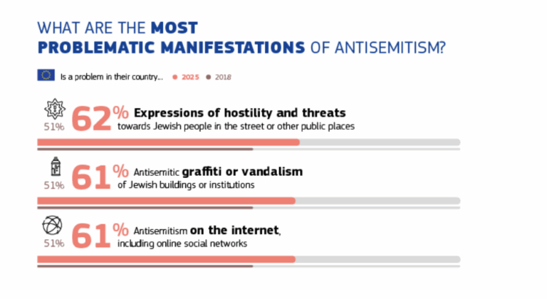Σε ευρωπαϊκό επίπεδο, τα στοιχεία του Ευρωβαρόμετρου αποτυπώνουν μια σαφή τάση αυξανόμενης ανησυχίας. Το 55% των Ευρωπαίων θεωρεί ότι ο αντισημιτισμός αποτελεί πρόβλημα στη χώρα του, ενώ το 47% εκτιμά ότι έχει αυξηθεί την τελευταία πενταετία. Η εχθρότητα σε δημόσιους χώρους, τα αντισημιτικά γκράφιτι και ο αντισημιτισμός στο διαδίκτυο αναφέρονται ως οι συχνότερες εκδηλώσεις, με ποσοστά που ξεπερνούν το 60%. Παράλληλα, σχεδόν επτά στους δέκα Ευρωπαίους θεωρούν ότι οι συγκρούσεις στη Μέση Ανατολή επηρεάζουν τον τρόπο με τον οποίο γίνονται αντιληπτοί οι Εβραίοι στη χώρα τους.
