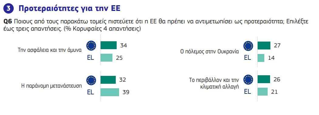 Ως προς τις πολιτικές προτεραιότητες, 34% των Ευρωπαίων θεωρούν ότι η ΕΕ πρέπει να εστιάσει στην ασφάλεια και άμυνα, 32% στην παράτυπη μετανάστευση και 27% στον πόλεμο στην Ουκρανία.