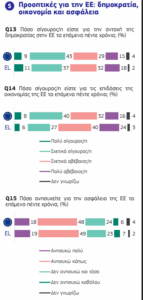 Στο ερώτημα πόσο σίγουρος/η είστε για την αντοχή της δημοκρατίας στην ΕΕ τα επόμενα πέντεχρόνια; Μόνο το 11% των Ελλήνων απαντά πολύ σίγουρο ενώ το αντίστοιχο ποσοστό σε επίπεδο ΕΕ είναι 9%. Σχετικά σίγουρο απαντά το 37% (στην ΕΕ το ποσοστό είναι 43%), σχεδόν αβέβαιο λέει το 32% (29% στην ΕΕ) πολύ αβέβαιο προσθέτει το 18% των ελλήνων ερωτηθέντων (15% ΕΕ)