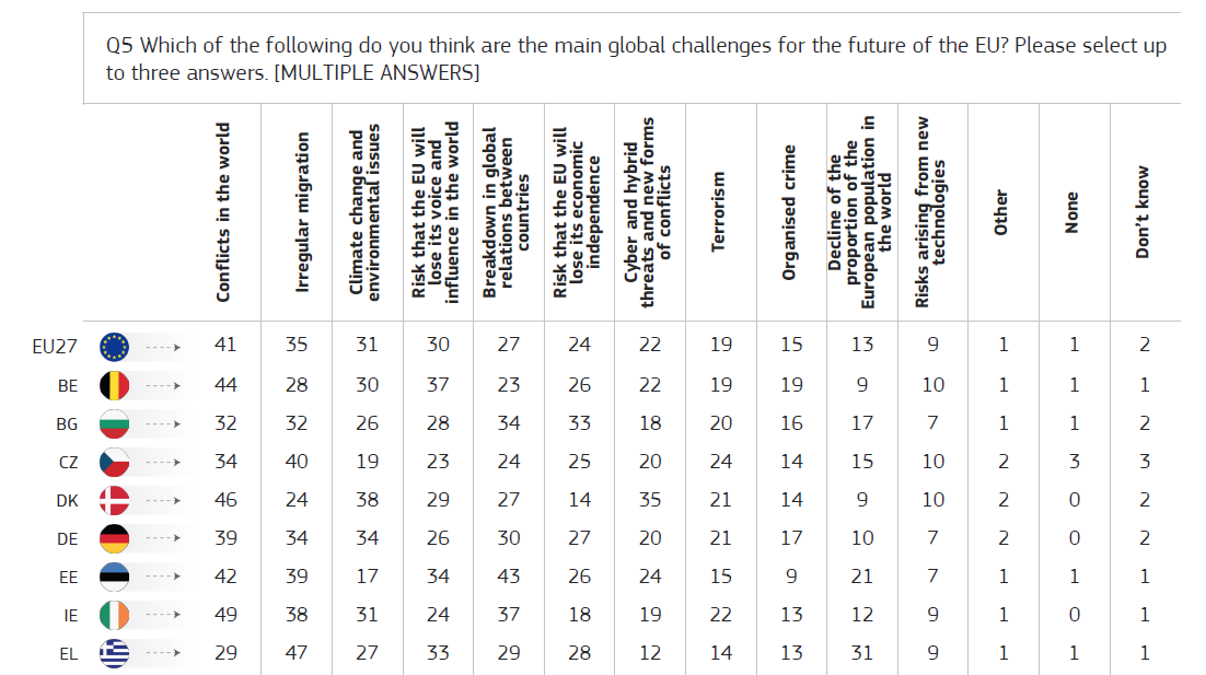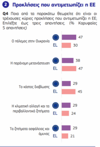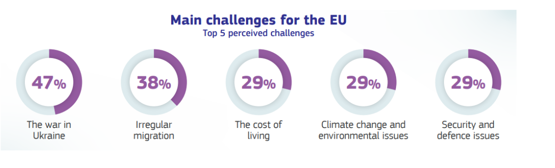Ο πόλεμος στην Ουκρανία εξακολουθεί να θεωρείται η κυριότερη τρέχουσα πρόκληση για την ΕΕ (47%), ενώ για το μέλλον, οι διεθνείς συγκρούσεις (41%) αποτελούν το σημαντικότερο ζήτημα, ακολουθούμενες από την παράτυπη μετανάστευση (35%) και την κλιματική αλλαγή και τα περιβαλλοντικά ζητήματα (31%).