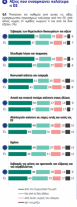 • 50% θεωρεί ότι η ΕΕ εκφράζει καλύτερα την ελευθερία λόγου και έκφρασης και το 43% αναγνωρίζει την ΕΕ ως φορέα κοινωνικής ισότητας και ευημερίας.