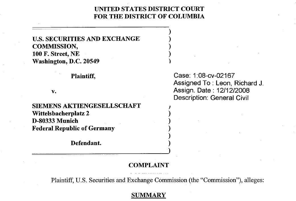 Στις ΗΠΑ, το Ομοσπονδιακό Δικαστήριο καταδίκασε τη Siemens για εσκεμμένη καταστρατήγηση, αδυναμία να διατηρήσει επαρκή εσωτερικό έλεγχο και αποτυχία να συμμορφωθεί με την αμερικανική νομοθεσία για την καταπολέμηση της διαφθοράς (FCPA).