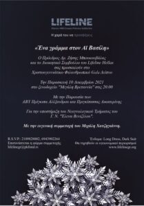 Ο Γενικός Γραμματέας του διεθνούς ανθρωπιστικού οργανισμού Lifeline Hellas, σας προσκαλεί στο Χριστουγεννιάτικο φιλανθρωπικό gala – δείπνο που διοργανώνεται την Παρασκευή 10 Δεκεμβρίου στις 20:00 στο ξενοδοχείο Μεγάλη Βρεταννία.