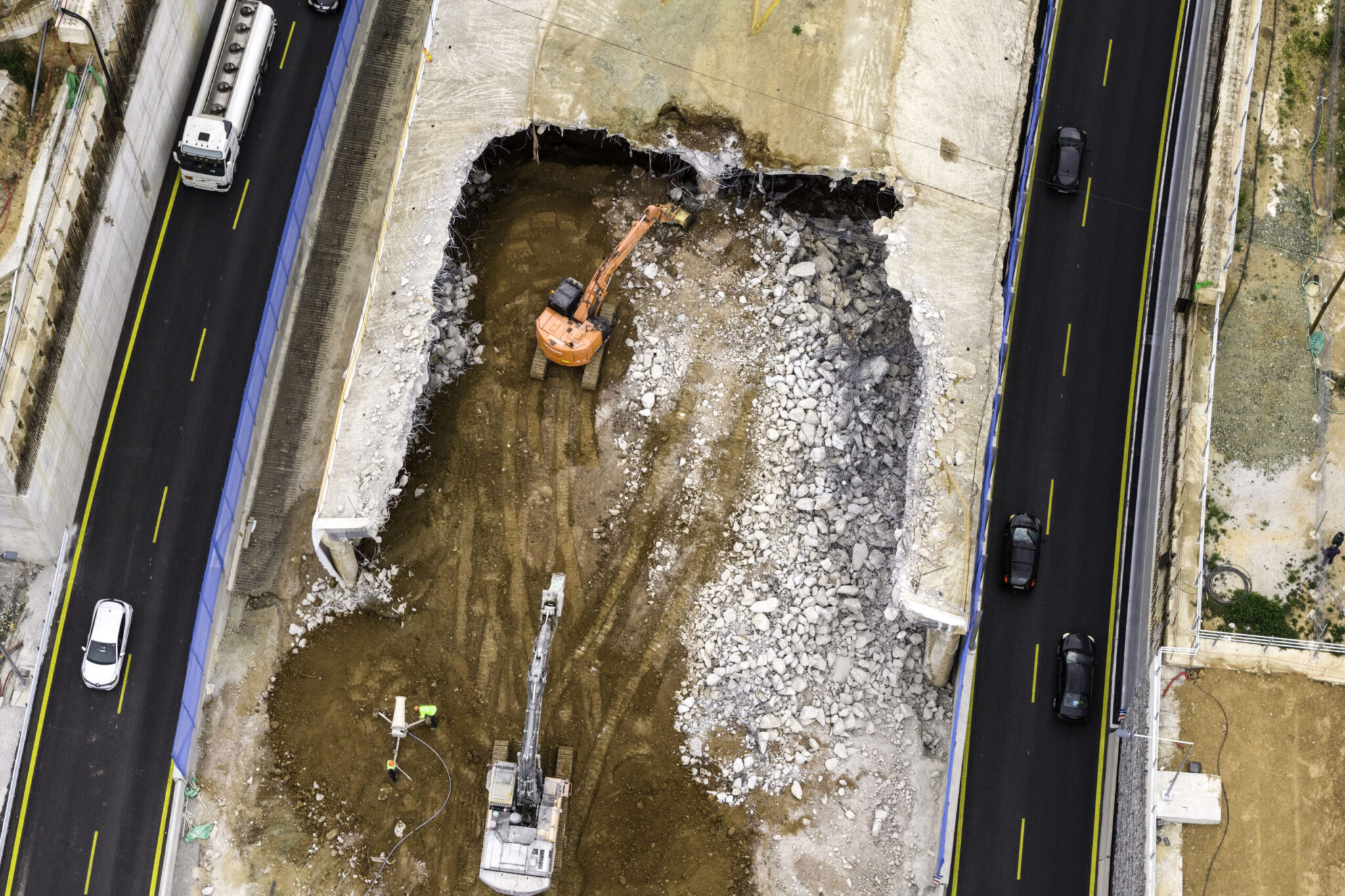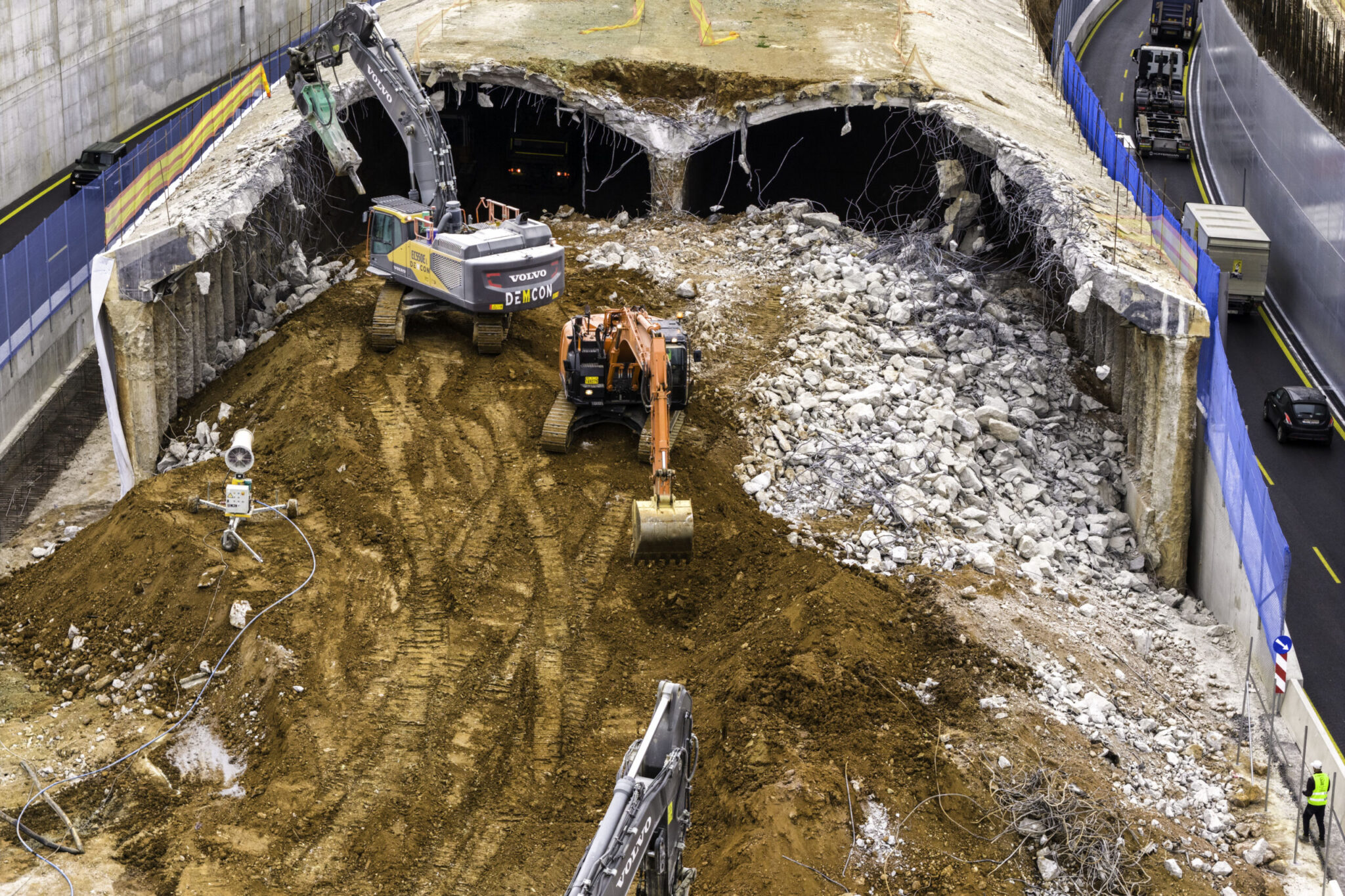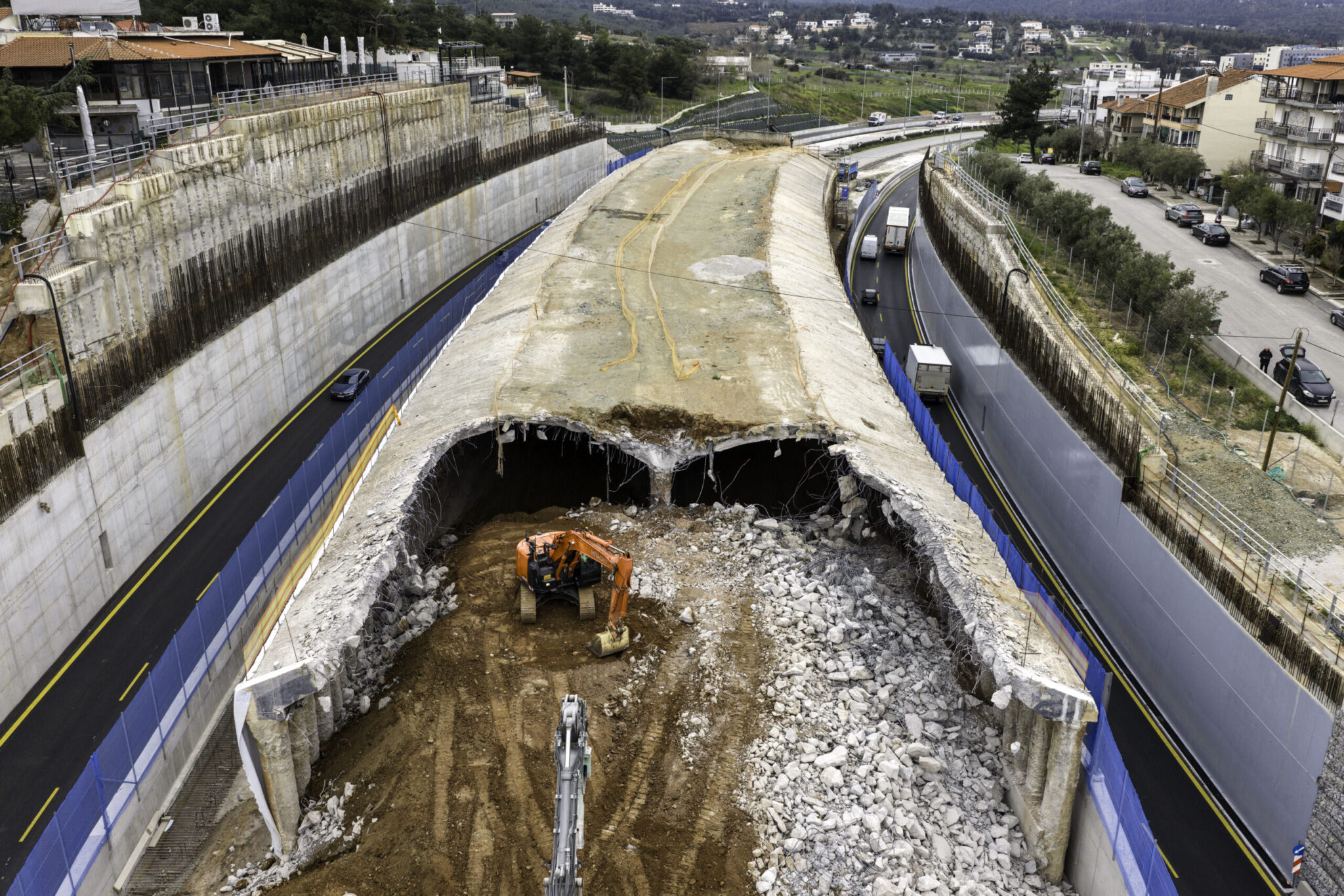 Τόσο σημερινές εικόνες, όσο και σε βίντεο από drone καταγράφεται η πρόοδος των εργασιών για την κατεδάφιση του τούνελ και τα στιγμιότυπα είναι εντυπωσιακά.