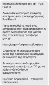 Στα παραπλανητικά μηνύματα, οι απατεώνες χρησιμοποιούν την ταυτότητα της πλατφόρμας gov.gr και καλούν τους πολίτες να πατήσουν σε σύνδεσμο προκειμένου δήθεν να «ενεργοποιήσουν» την κάρτα Fuel Pass III, ώστε να λάβουν την κρατική οικονομική ενίσχυση.