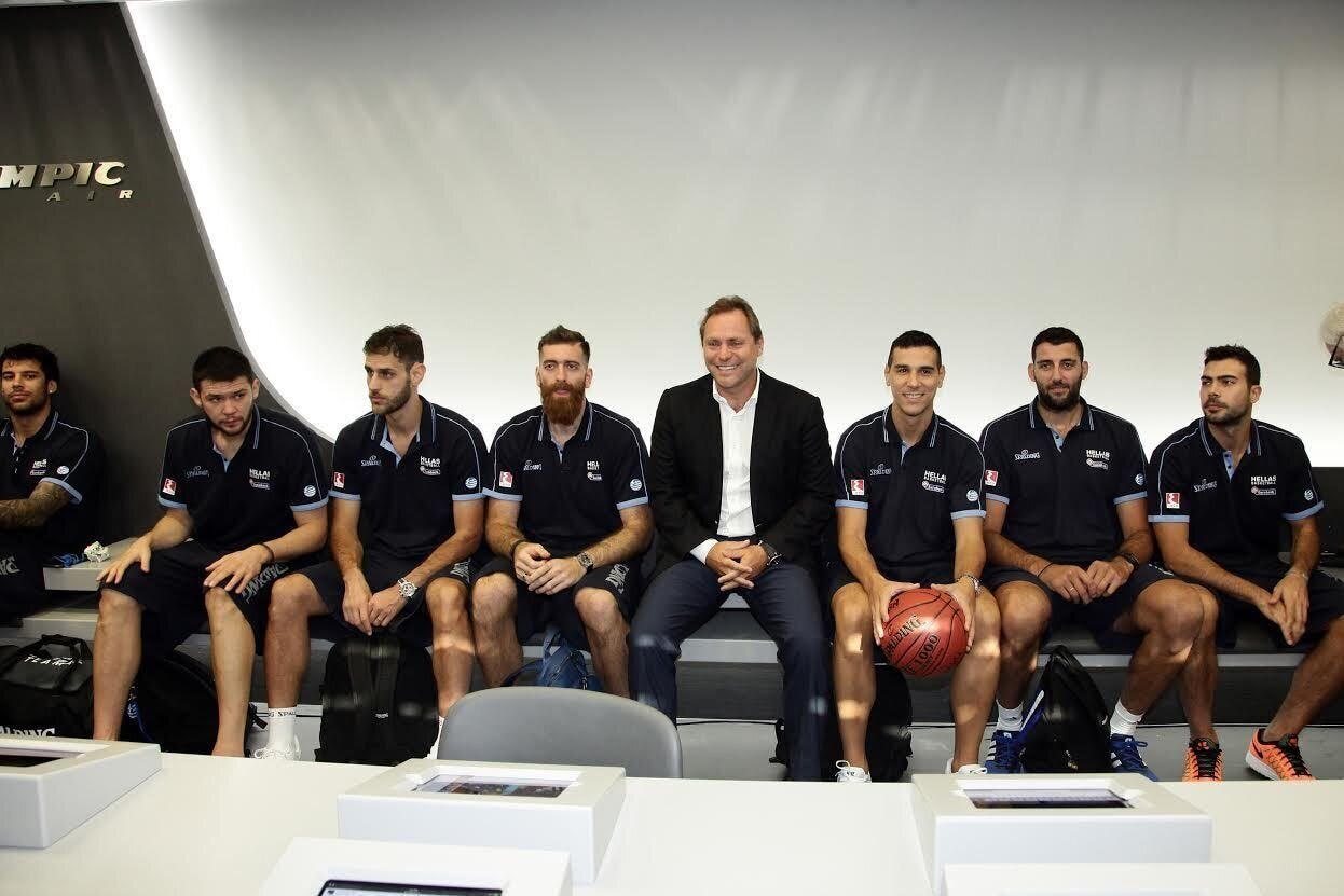 Ο Αντιπρόεδρος της AEGEAN, κ. Ευτύχιος Βασιλάκης μαζί με τους παίκτες της Εθνικής Ομάδας Μπάσκετ.