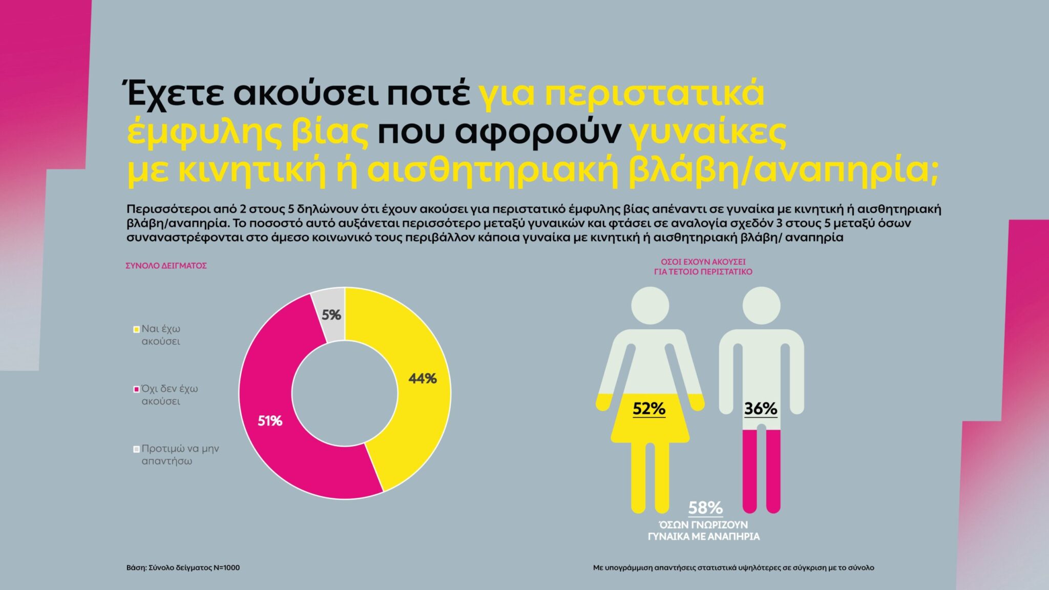 - Περισσότερα από 2 στα 5άτομα δηλώνουν ότι έχουν ακούσει για περιστατικό έμφυλης βίας σε γυναίκα με αναπηρία