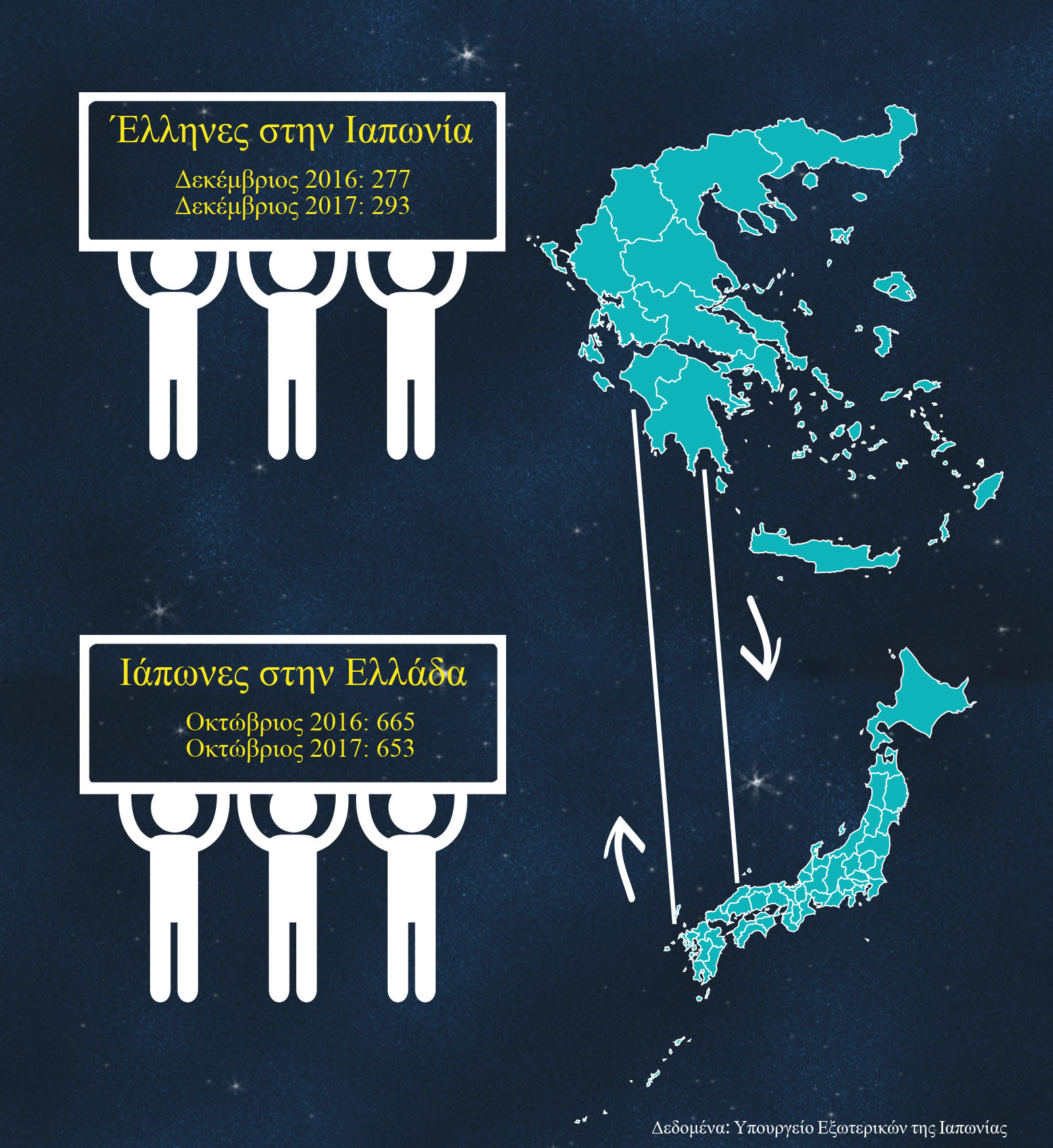 Σύμφωνα με στατιστικά δεδομένα του Υπουργείου Εξωτερικών της Ιαπωνίας, το 2017 ζούσαν στην Ελλάδα 653 Ιάπωνες και αντίστοιχα στην Ιαπωνία 293 Έλληνες.