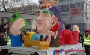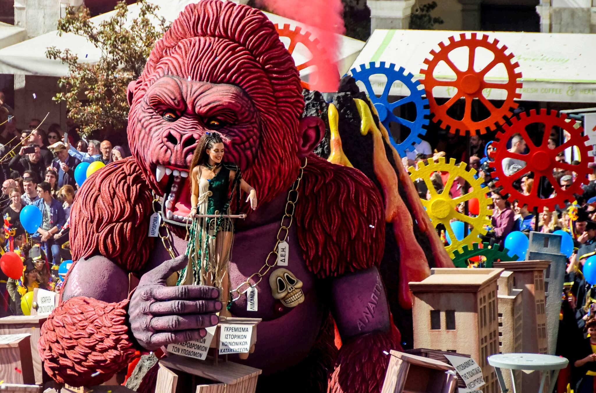 Κατόπιν, παρήλασε το μεγαλοπρεπές και εντυπωσιακό άρμα του φετινού βασιλιά καρνάβαλου που σατίριζε την αστική δημοκρατία, ενώ το άρμα της βασίλισσας, Αναστασίας Ψαρρού, ήταν η ανάπτυξη με τη μορφή ενός εξωπραγματικού τέρατος, του γορίλα Κινγκ – Κονγκ.