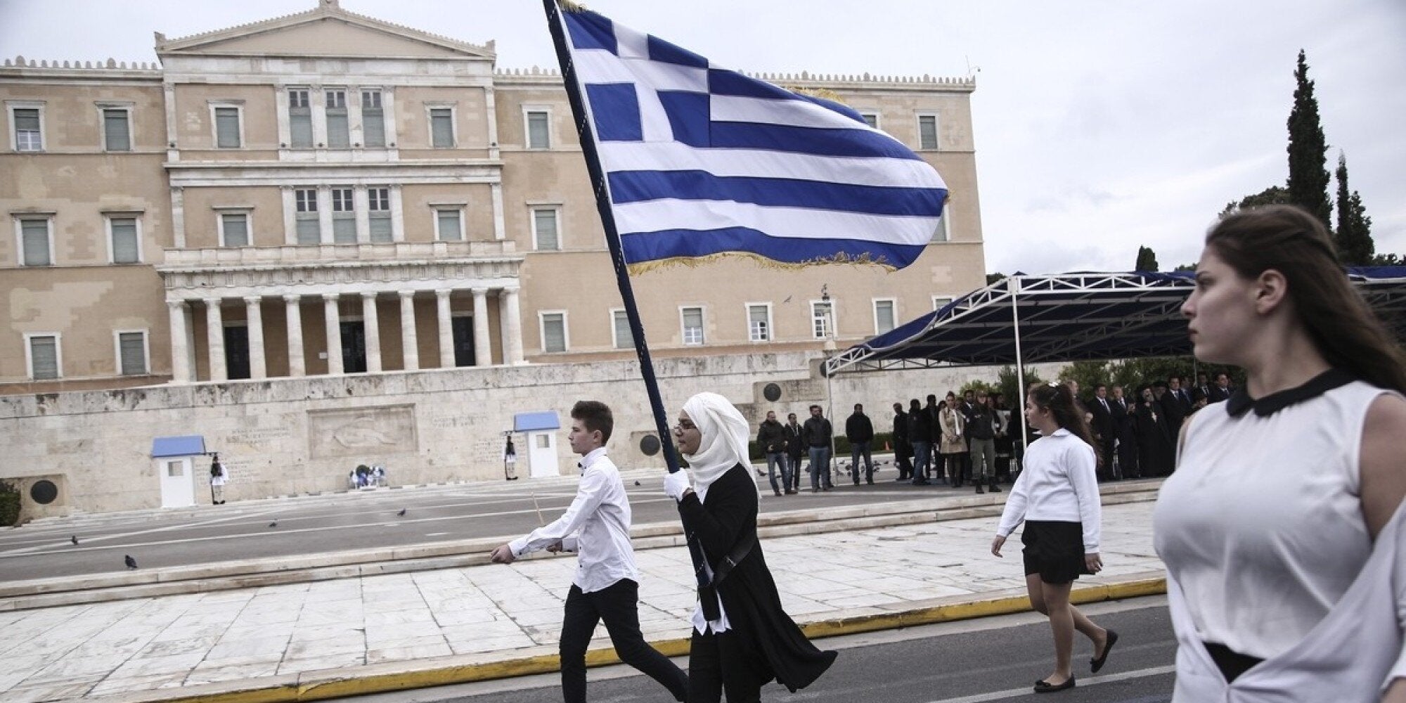 Η εικόνα αυτή δεν είναι άλλη από την όψη μιας μουσουλμάνας σημαιοφόρου να παρελαύνει περήφανη στο κέντρο της Αθήνας φορώντας τη μαντήλα της και κρατώντας στα χέρια της την ελληνική σημαία.