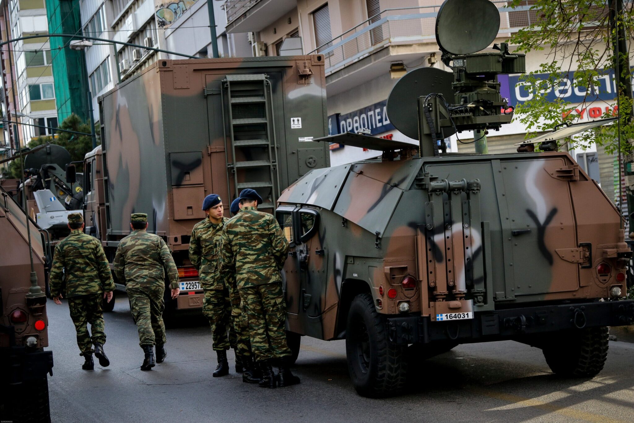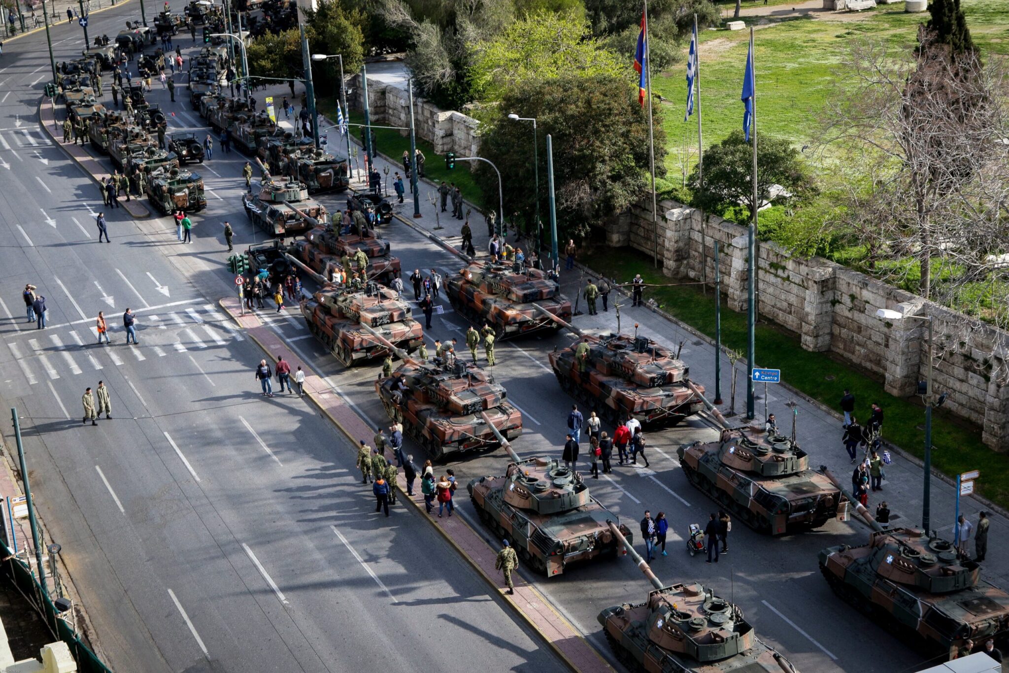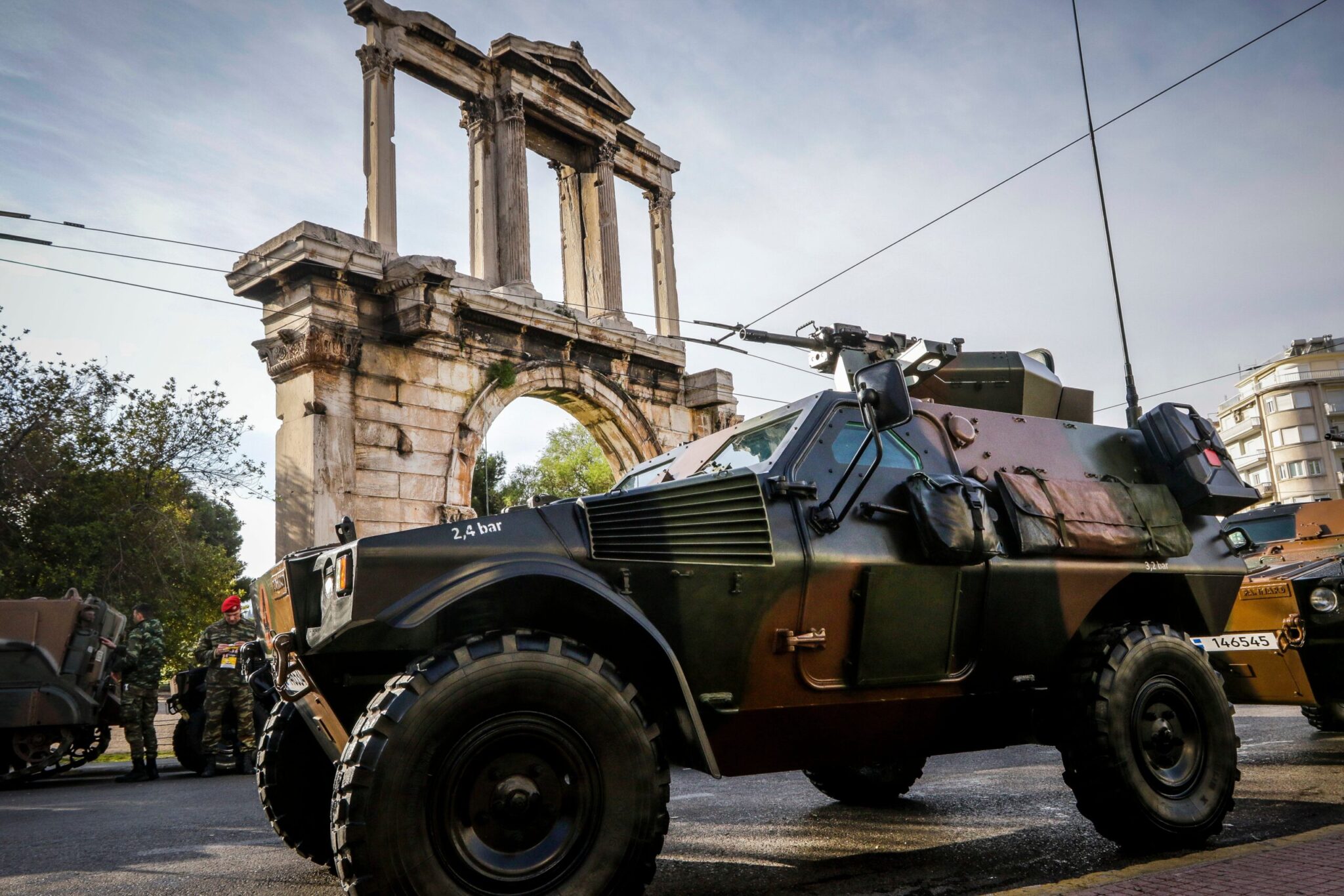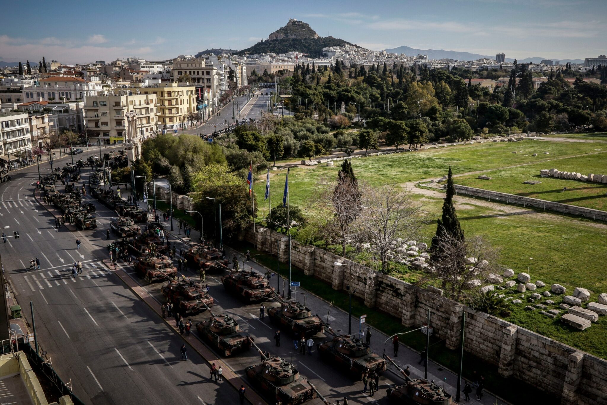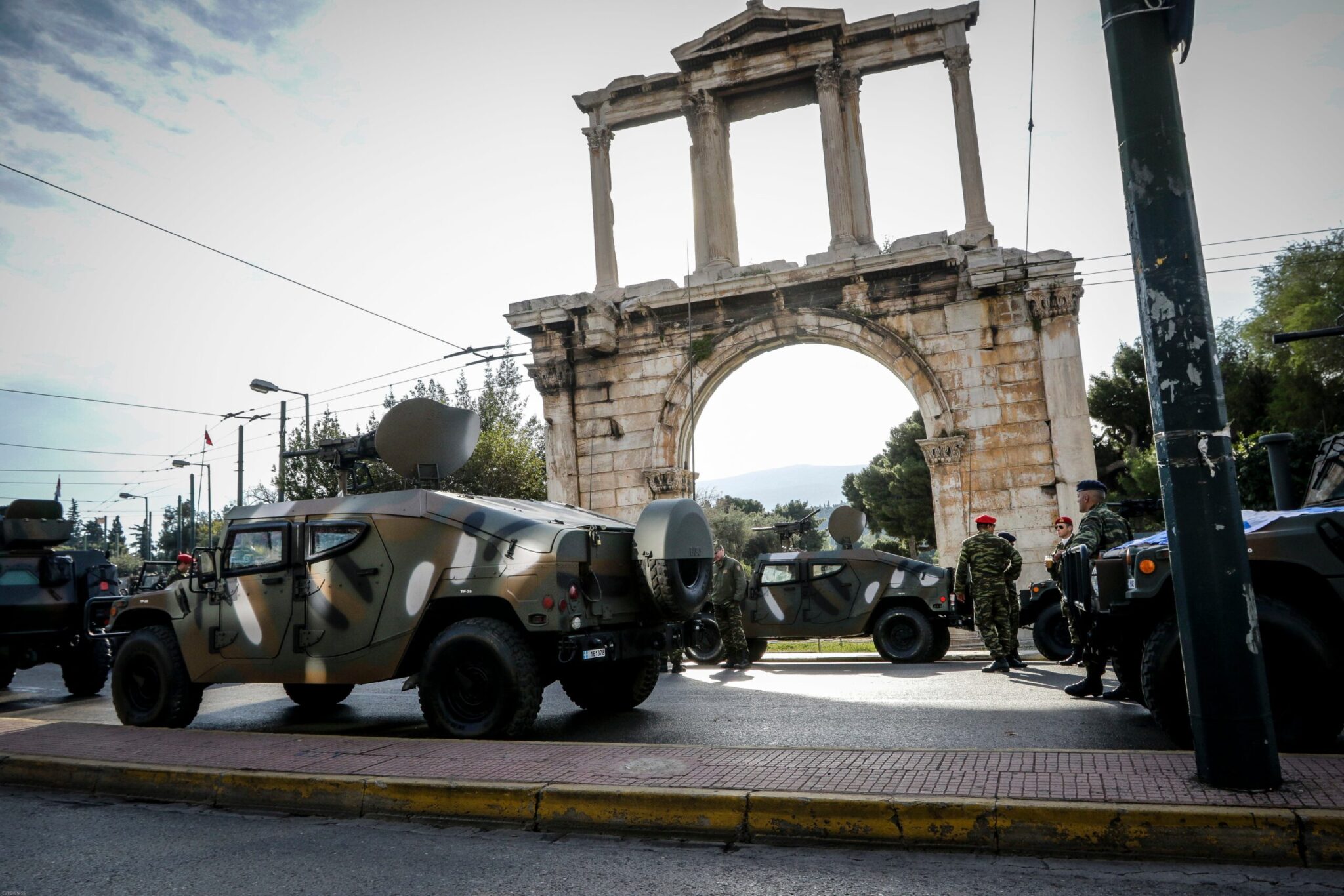 Οι άνδρες και οι γυναίκες των Ενόπλων Δυνάμεων Ένοπλες, με τα άρματα και άλλα οχήματα, είχαν συγκεντρωθεί και παραταχθεί από νωρίς στην περιοχή κοντά στην Αψίδα του Αδριανού και τη λεωφόρο Συγγρού.