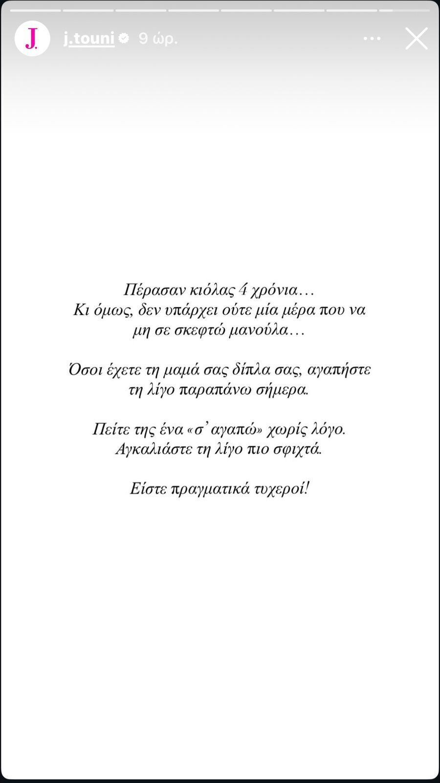 «Όσοι έχετε τη μαμά σας δίπλα σας, αγαπήστε την λίγο παραπάνω σήμερα. Πείτε της ένα “σ’ αγαπώ” χωρίς λόγο. Αγκαλιάστε τη λίγο πιο σφιχτά».