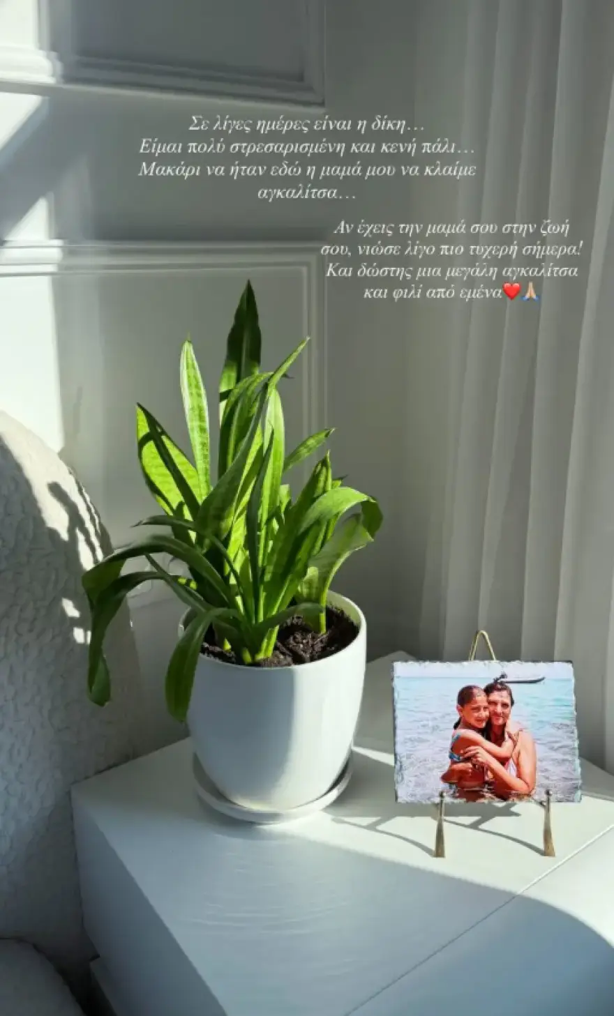 Η Ιωάννα Τούνη μοιράστηκε μία εικόνα από το σπίτι της με μία φωτογραφία από την παιδική της ηλικία στην αγκαλιά της μητέρας της να διακρίνεται πάνω σε ένα τραπεζάκι. «Σε λίγες ημέρες είναι η δίκη. Είμαι πολύ στρεσαρισμένη και κενή πάλι. Μακάρι να ήταν εδώ η μαμά μου να κλαίμε αγκαλίτσα. Αν έχεις τη μαμά σου στη ζωή σου, νιώσε λίγο πιο τυχερή σήμερα. Και δώσε της μια μεγάλη αγκαλιά και φιλί από εμένα», έγραψε στην ανάρτησή της.