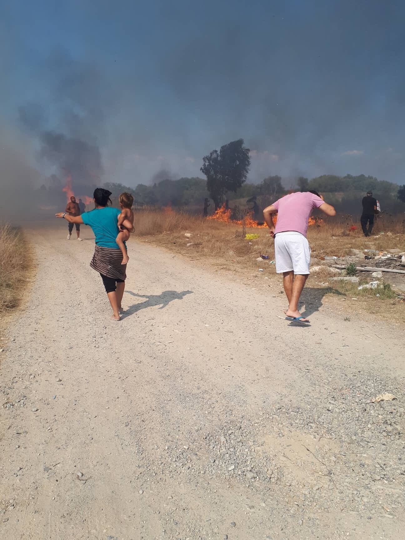Η πύρινη λαίλαπα έχοντας ως σύμμαχο τον αέρα που φυσούσε στην περιοχή κατάφερε να φτάσει στις αυλές των σπιτιών ενώ στο πέρασμά της κατάφερε να τυλίξει στις φλόγες κάποια ξύλινα παραπήγματα των ρομά.