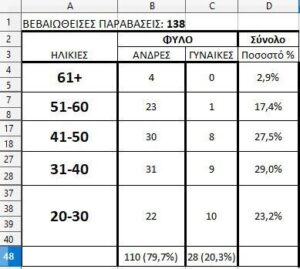 Από την ανάλυση των παραπάνω στοιχείων προκύπτει ότι το 9% των οδηγών που ελέχθησαν βρέθηκαν να οδηγούν υπό την επήρεια οινοπνεύματος. Περισσότερα στοιχεία σχετικά με την κατανομή των παραβατών ανά φύλο και ηλικία μπορείτε να δείτε στον σχετικό πίνακα.