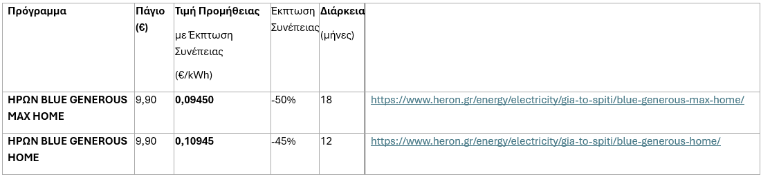 | ΗΡΩΝ BLUE GENEROUS MAX HOME | 9,90 | 0,09450 | -50% | 18 | https://www.heron.gr/energy/electricity/gia-to-spiti/blue-generous-max-home/ |