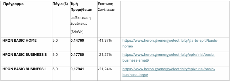| ΗΡΩΝ BASIC BUSINESS L | 5,0 | 0,17941 | -21,24% | https://www.heron.gr/energy/electricity/epixeirisi/basic-business-large/ |