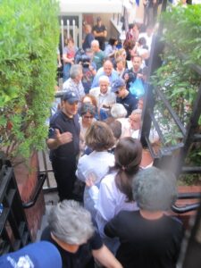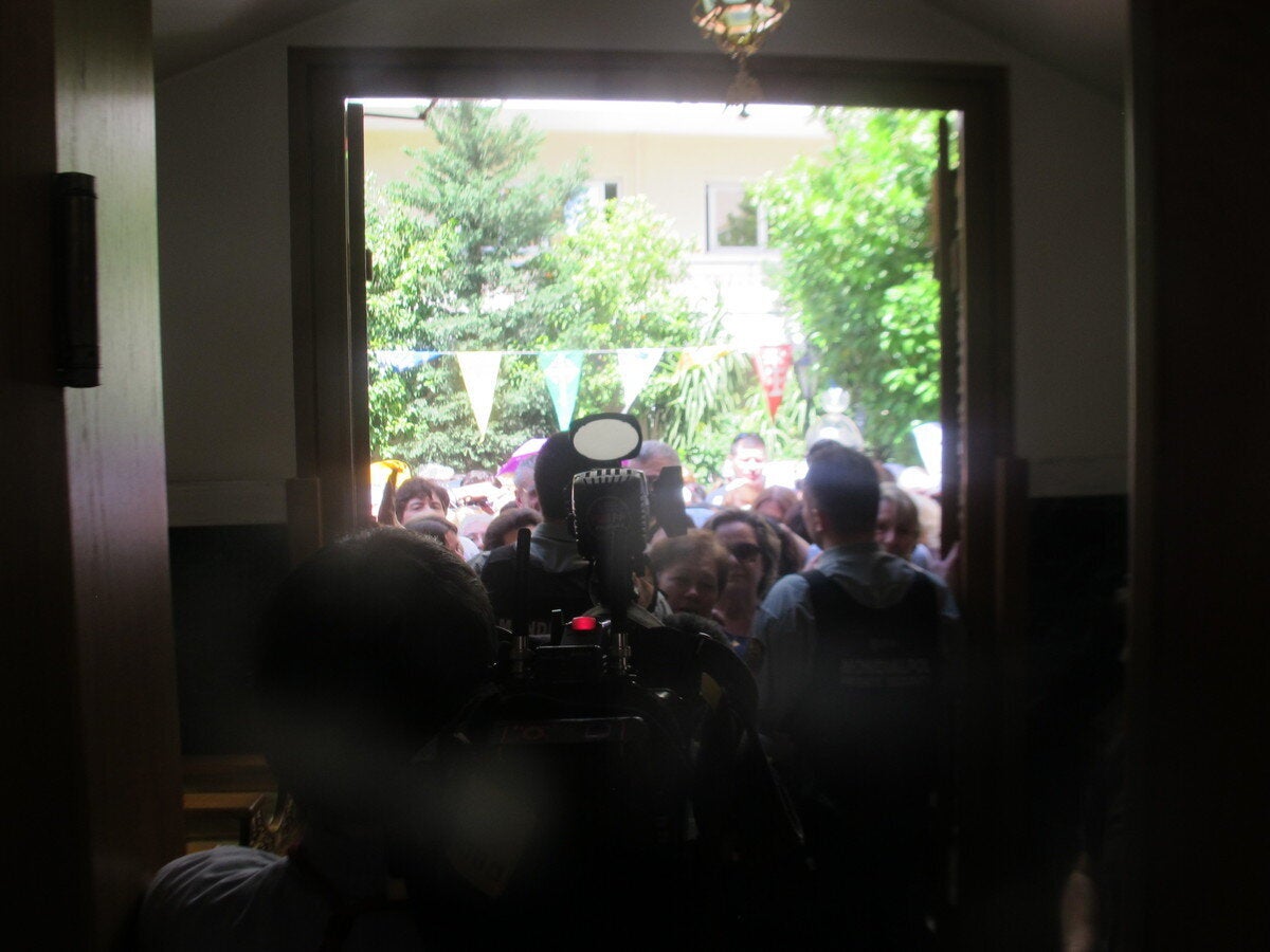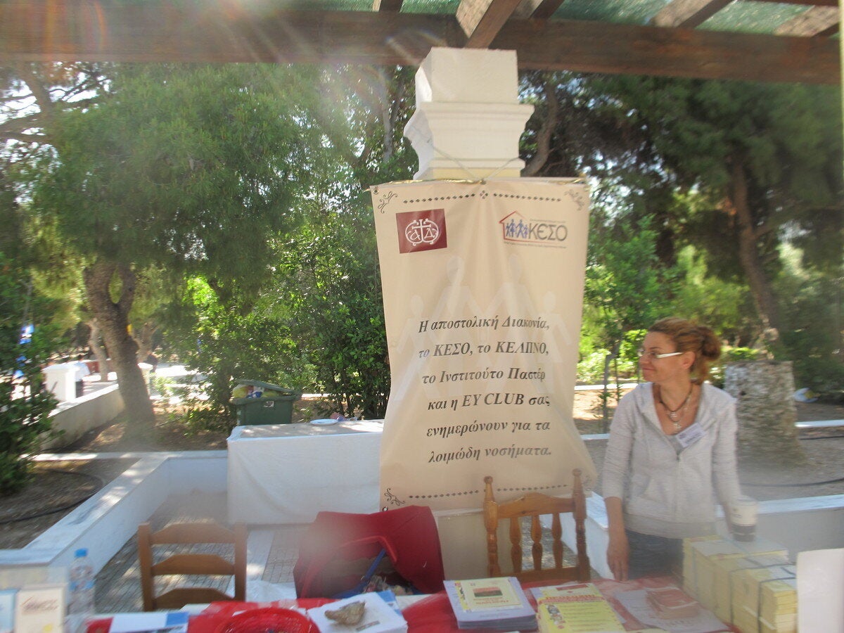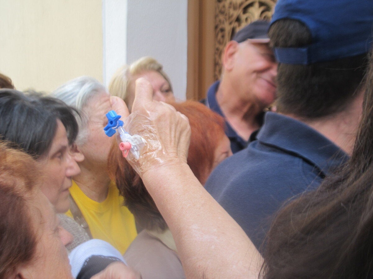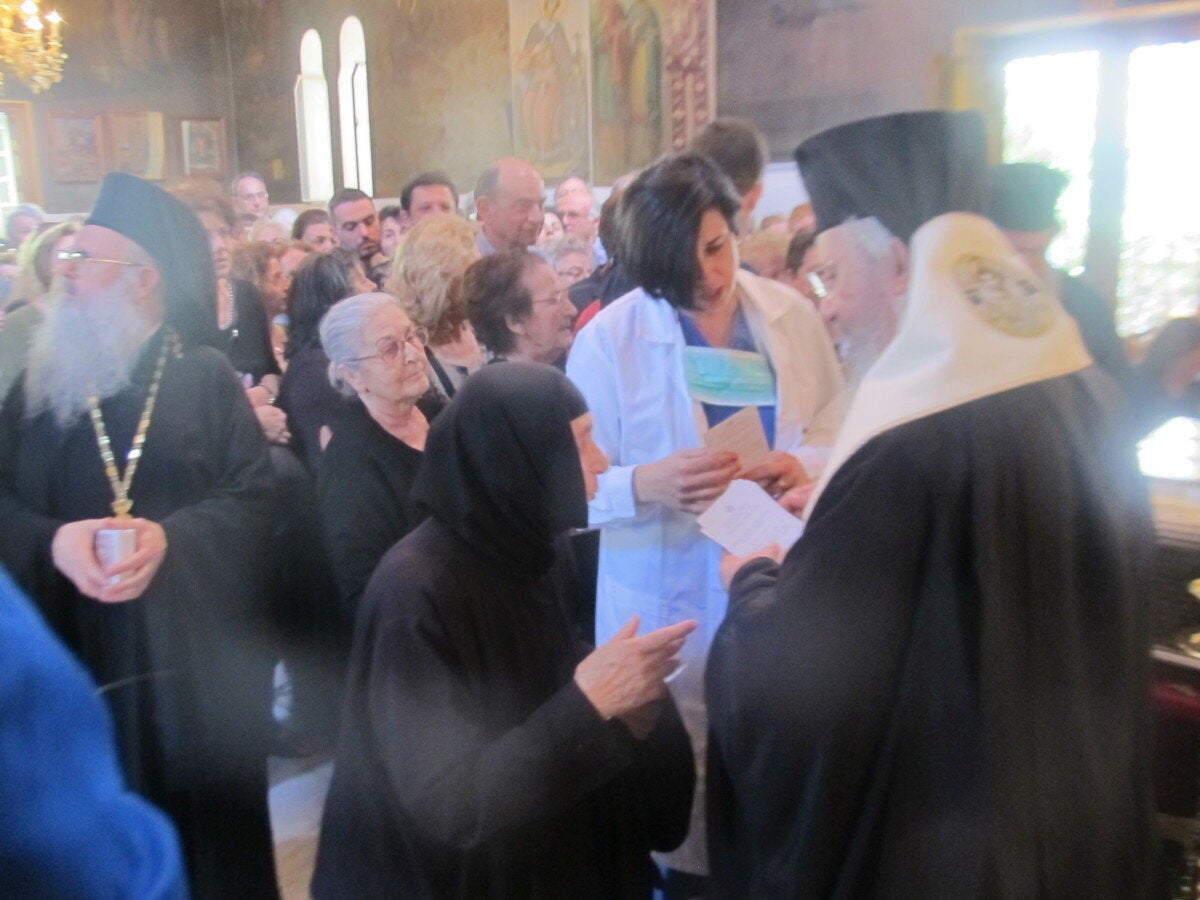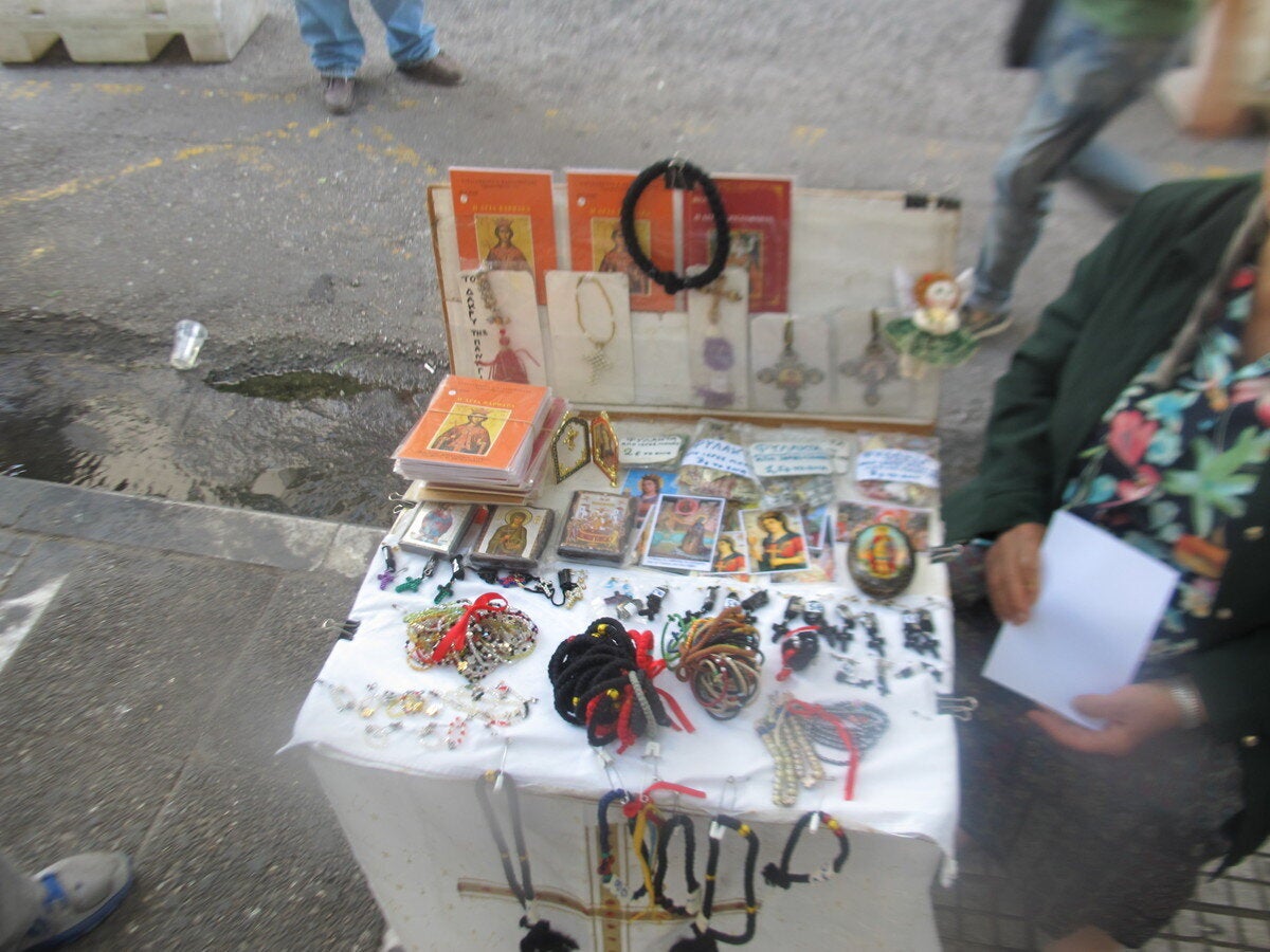 Ανεβαίνοντας προς τον ναό, δυο τρεις γυναίκες ζητιάνευαν – αστυνομικοί με αυστηρό ύφος τις απομάκρυναν, απειλώντας τις με μήνυση για επαιτεία και διατάσσοντας τους υφιστάμενους τους να τις οδηγήσουν στο τμήμα. Δύο περίπτερα, ένα για την ενημέρωση του κοινού για τα λοιμώδη νοσήματα, προϊόν εξαιρετικής συνεργασίας του ΚΕΕΛΠΝΟ, του Ινστιτούτου Παστέρ και της Αποστολικής Διακονίας και άλλο ένα από όπου οι πιστοί μπορούσαν να αγοράσουν θρησκευτικά αντικείμενα- βίους αγίων, εικόνες, φυλαχτά.
